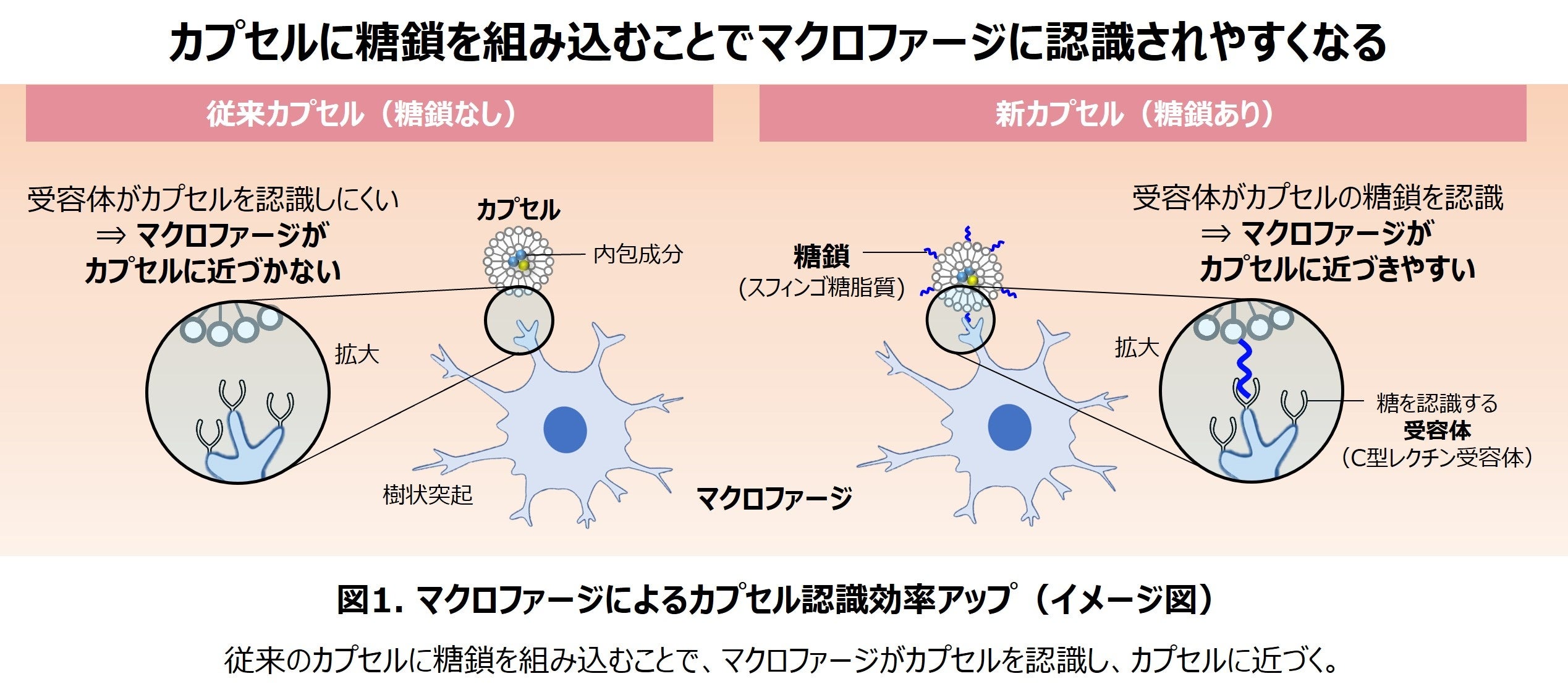 マクロファージには物質表面の分子構造を認識する受容体が数多く存在し、受容体が反応すると異物とみなし貪食します。本研究ではその仕組みを活用し、カプセルに異物と似た標識を付けることとしました。マクロファージがカプセルを異物と認識すれば、マクロファージからカプセルに近づき、成分が効率的に届くのではないかと考えたのです(図1)。着目したのは、「糖鎖」を認識する受容体です。これは、認識の仕組みが単純で、一種類の受容体がさまざまな糖に反応することから、受容体から認識されやすく、かつカプセルへ組み込むのに必要な条件がそろった糖鎖を見つけやすいと考えたためです。