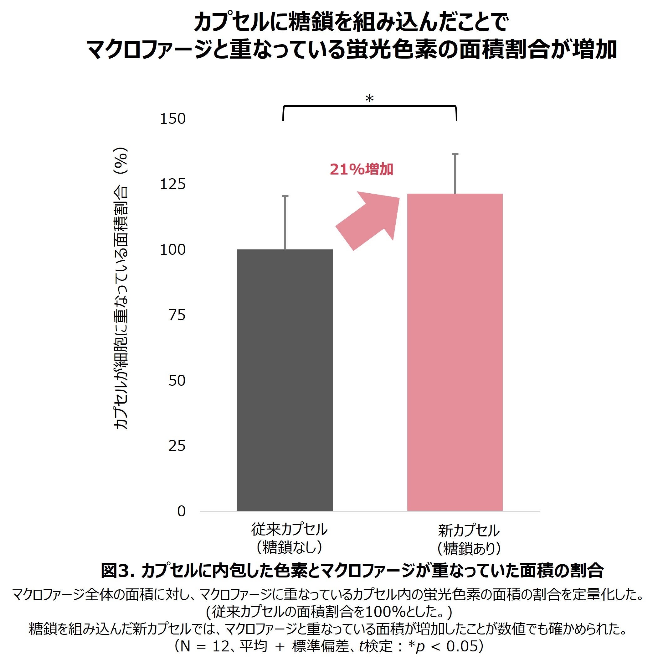 また定量的な評価として、顕微鏡画像中において、マクロファージ全体の面積に対する、マクロファージとカプセルの蛍光が重なっている部分の面積の割合を測定しました。その結果、糖鎖なしの従来カプセルに比べ、糖鎖ありの新カプセルの方が重なっている面積の割合が増加しており、定量的にも差があることを確認できました(図3)。
