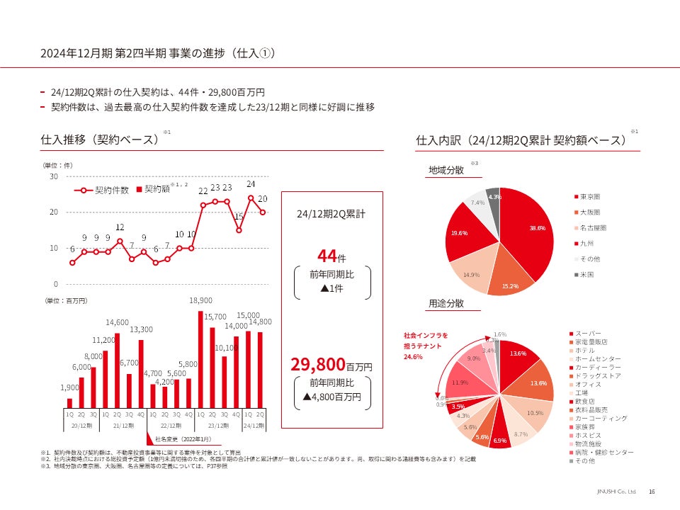 仕入は44件・29,800百万円(前年同期比▲1件・▲4,800百万円)となりました。過去最高の仕入契約件数を達成した2023年12月期と同様に好調に推移しています。