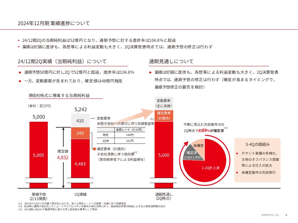 業績は好調に進捗していますが、米国子会社への貸付に伴う為替差益等による利益変動も大きいため、現時点では通期予想の修正を行わず、確度が高まるタイミングで、業績予想修正の要否を検討してまいります。