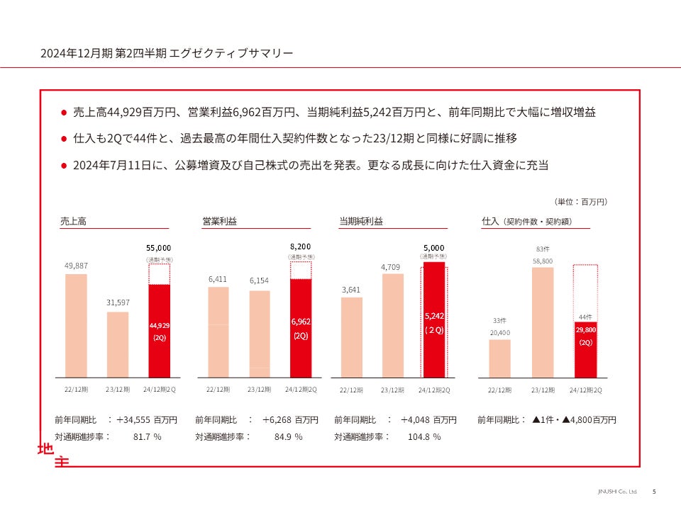2024年12月期第2四半期については、売上高44,929百万円(前年同期比+34,555百万円)、営業利益6,962百万円(同+6,268百万円)、親会社株主に帰属する中間純利益5,242百万円(同+4,048百万円)となり、⼤幅に増収増益となりました。
