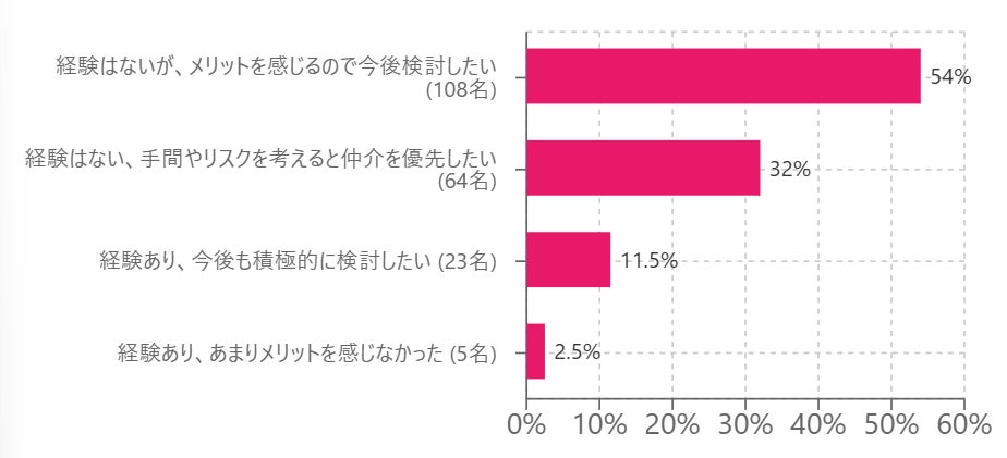 その結果、「経験はないが、メリットを感じるので今後検討したい」と回答した方が54.0%と過半数を占め、直接取引という手法への潜在的な関心が非常に高いことが明らかになりました。実際に「経験あり」と回答した方は合計14.0%と少数派でしたが、そのうちの多く(11.5%)は「今後も積極的に検討したい」と回答しており、経験者の満足度は比較的高い可能性が示唆されます。一方で、「経験はなく、仲介を優先したい」という慎重派も32.0%存在しました。