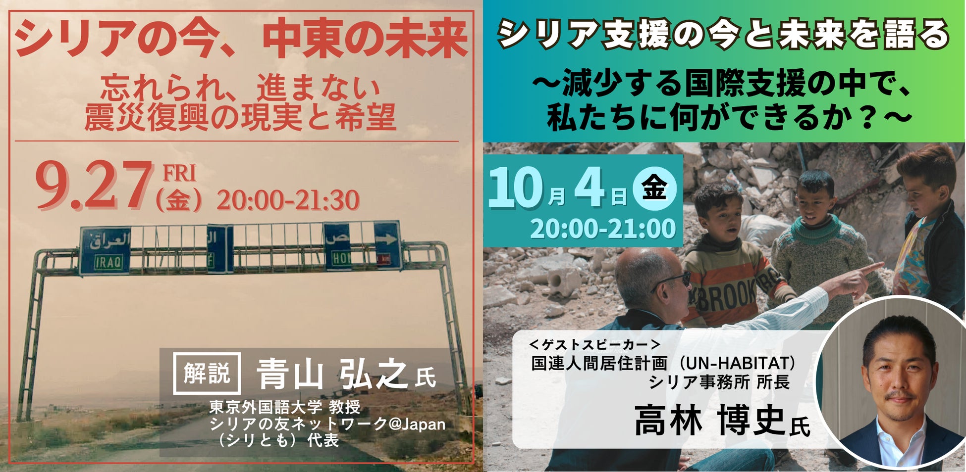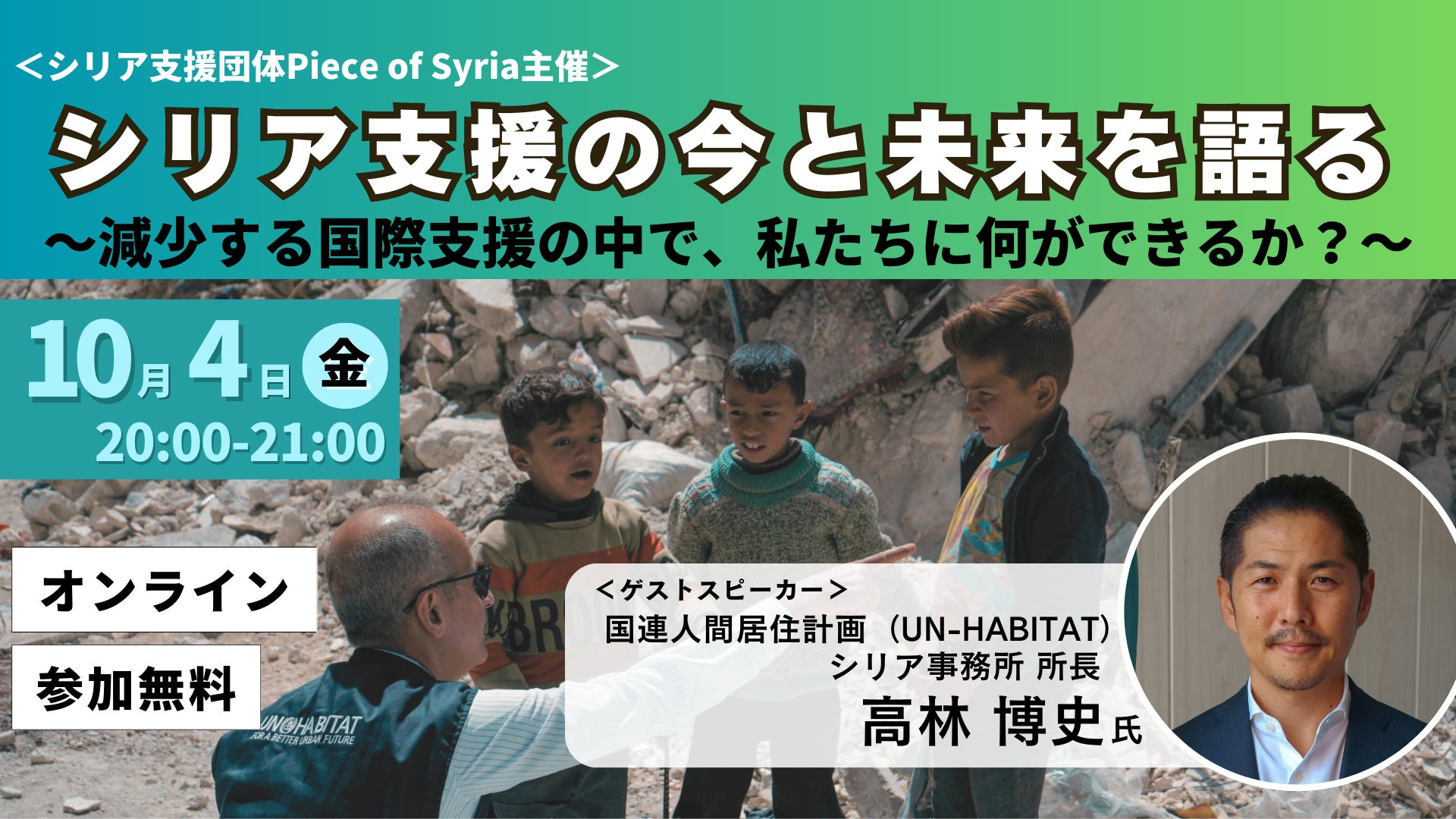 レバノン・ガザへの報道に集中する中、シリアでは紛争と震災からの復興が進まずに国際的な支援も減少し「戦争開始来の最も厳しい人道状況」とされています。NPO法人Piece of Syriaは、シリアに携わる専門家を招いたオンラインイベントを、9月27日(金)、10月4日(金)に開催します。シリアの現実を伝える貴重な機会となるこれらのイベントでは、シリアの未来への展望と私たちにできる支援について知る機会を提供します。