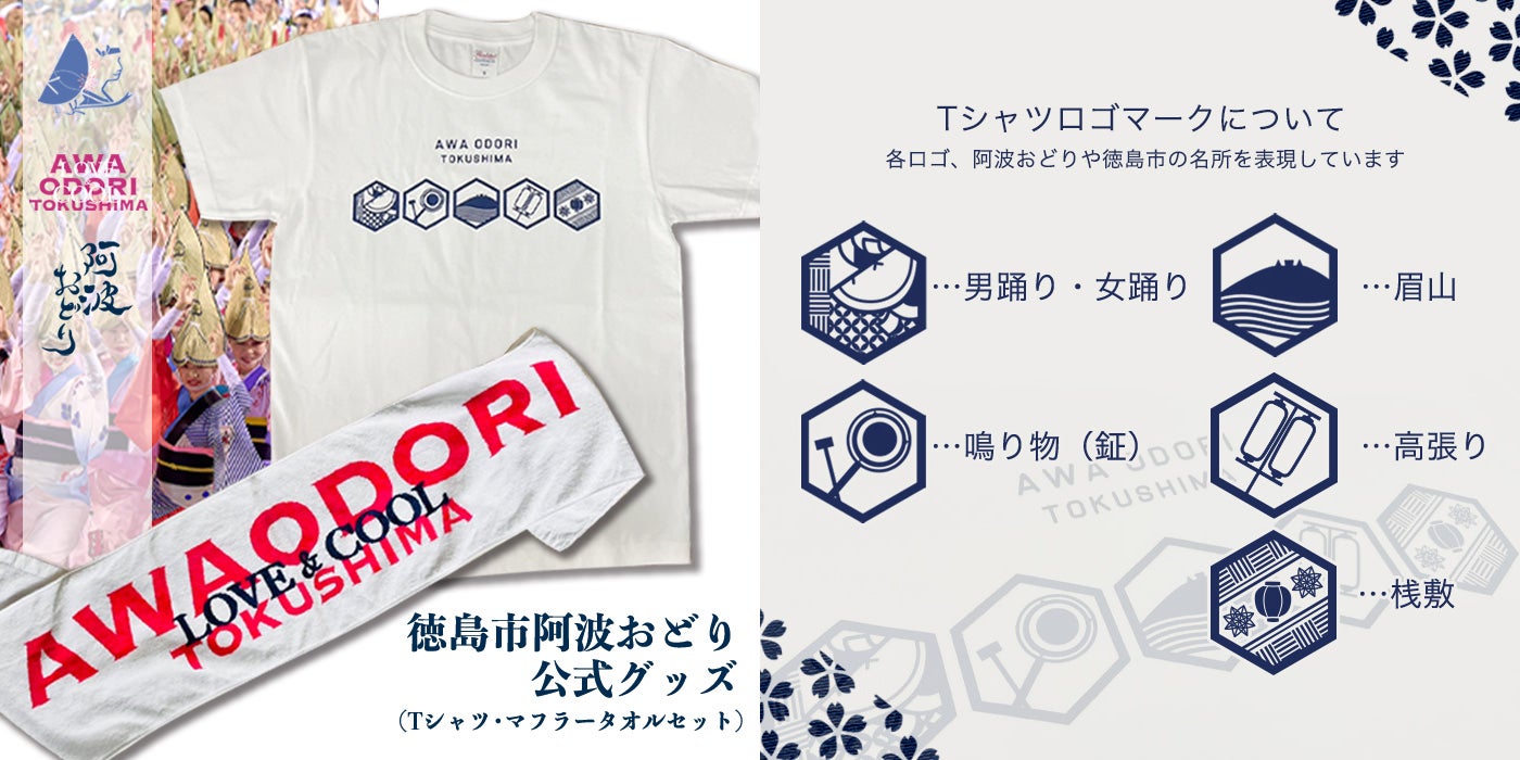 今回取扱いを開始したのは、「LOVE&COOL」がプリントされたマフラータオルに、万葉集にも詠まれた徳島市のシンボル「眉山」などのロゴマークをあしらったTシャツ、ハンカチを組み合わせた限定セットとなります。