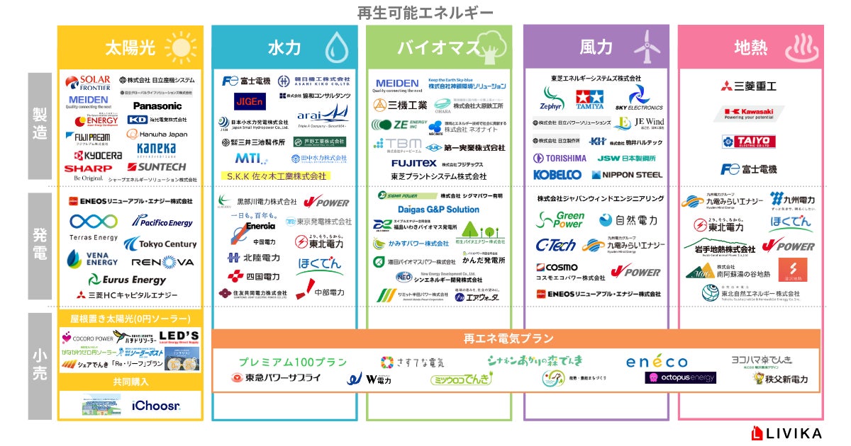 LIVIKA編集部は、再生可能エネルギーを製造・発電・小売の軸で分類したカオスマップ・業界地図を公開しました。