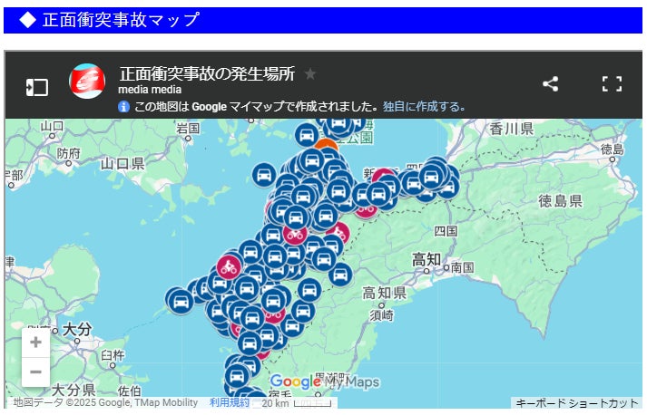 株式会社 愛媛新聞社(本社:愛媛県松山市大手町1丁目12-1、代表取締役社長:加藤令史)は、愛媛県警交通部交通企画課の協力を受け、愛媛県内で発生した交通事故データを基に、グラフ化による発生傾向の分析、Google earth pro、Google my map、ストリートビューなどを活用した事故現場の表示、主要な事故要因のアニメーション化を行い、交通事故の減少を目指す「シリーズ 愛媛の交通事故徹底分析~データ解析・ビジュアル化」に取り組んでいます。