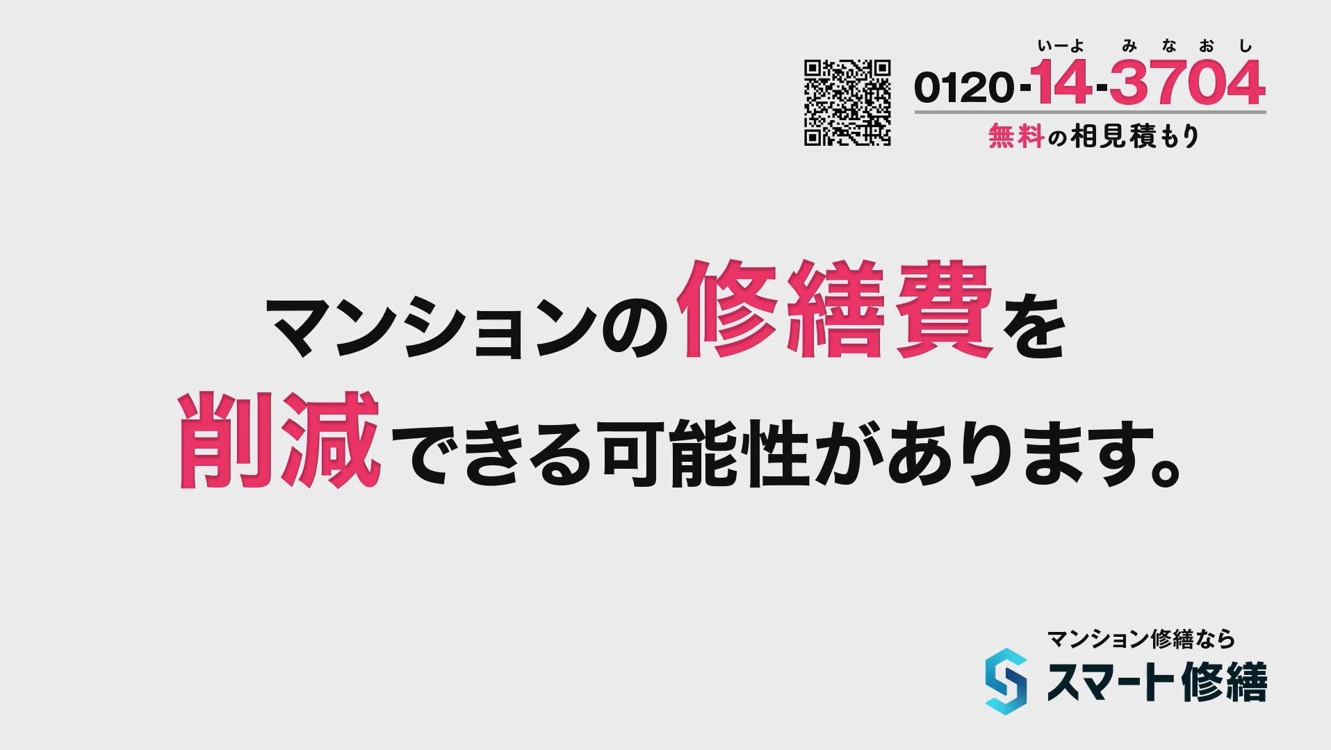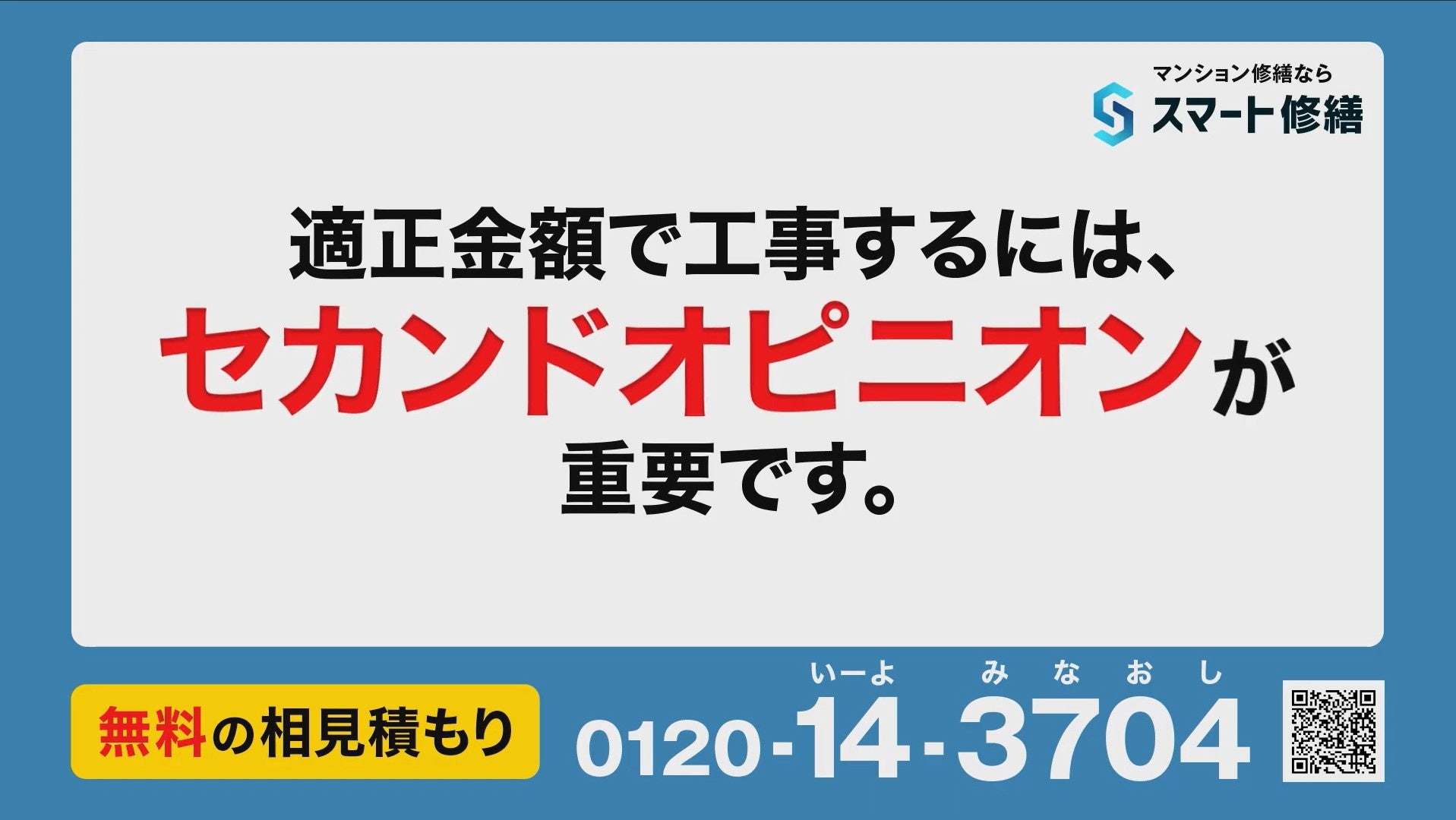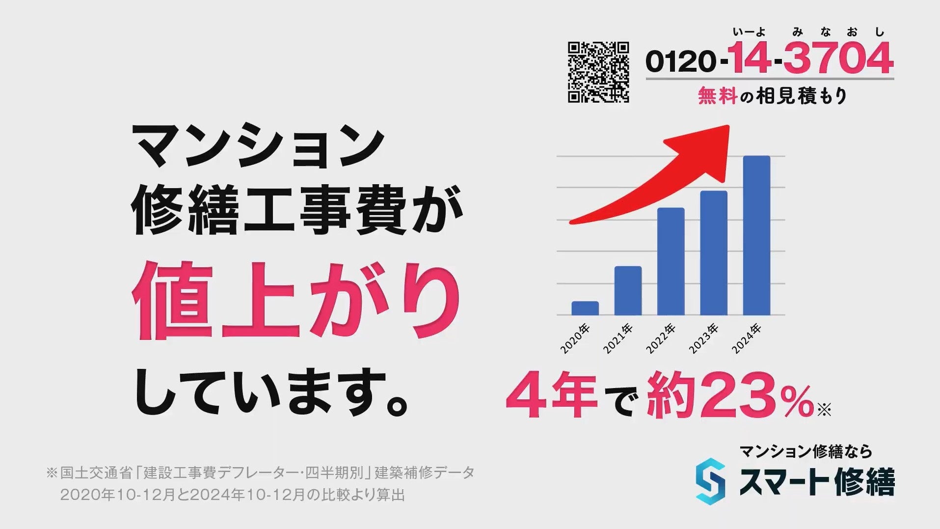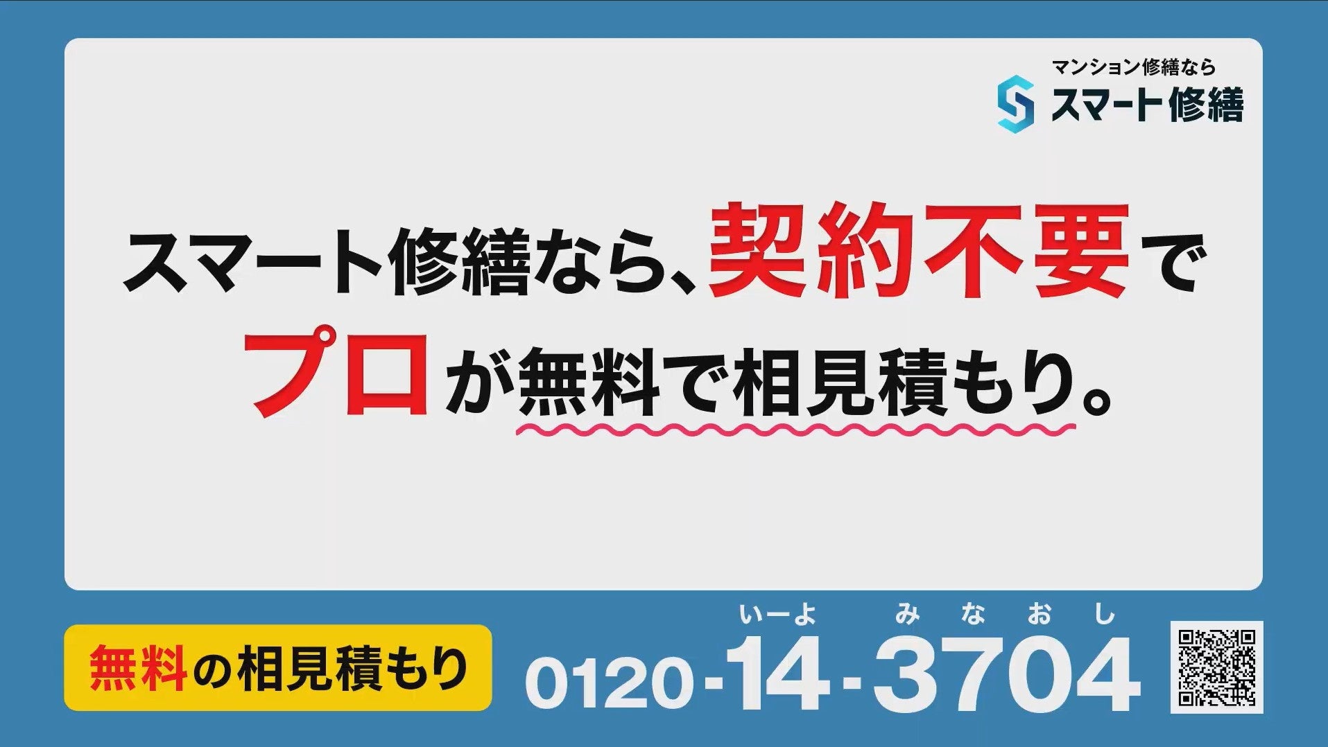 今回の新CMでは、マンションの修繕費は削減できる可能性があること、正しい相見積もりの重要性、工事費の値上がり状況をストレートにお伝えし、契約や費用の負担が無く利用いただける「スマート修繕」のご利用を提案しています。