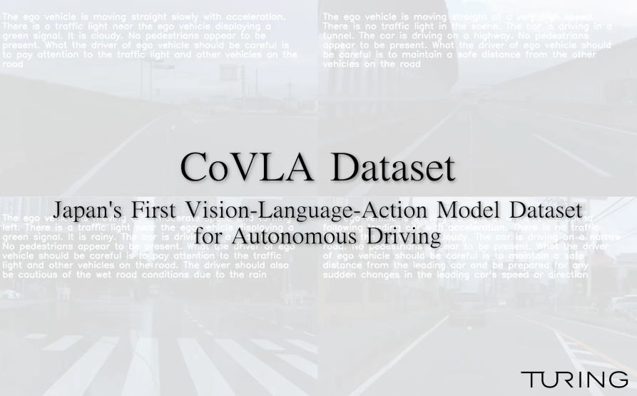 完全自動運転技術の開発に取り組むTuring株式会社(東京都品川区、代表取締役:山本 一成、以下「チューリング」)は、日本初(※)の自動運転向けVLAモデルデータセット「CoVLA(コブラ) Dataset」を開発し、一部を公開しました。そして、コンピュータービジョンの主要な国際会議WACV 2025(IEEE/CVF Winter Conference on Applications of Computer Vision 2025)において、同データセットの研究論文「CoVLA: Comprehensive Vision-Language-Action Dataset for Autonomous Driving」(以下、本論文)が採択されたことをお知らせします。