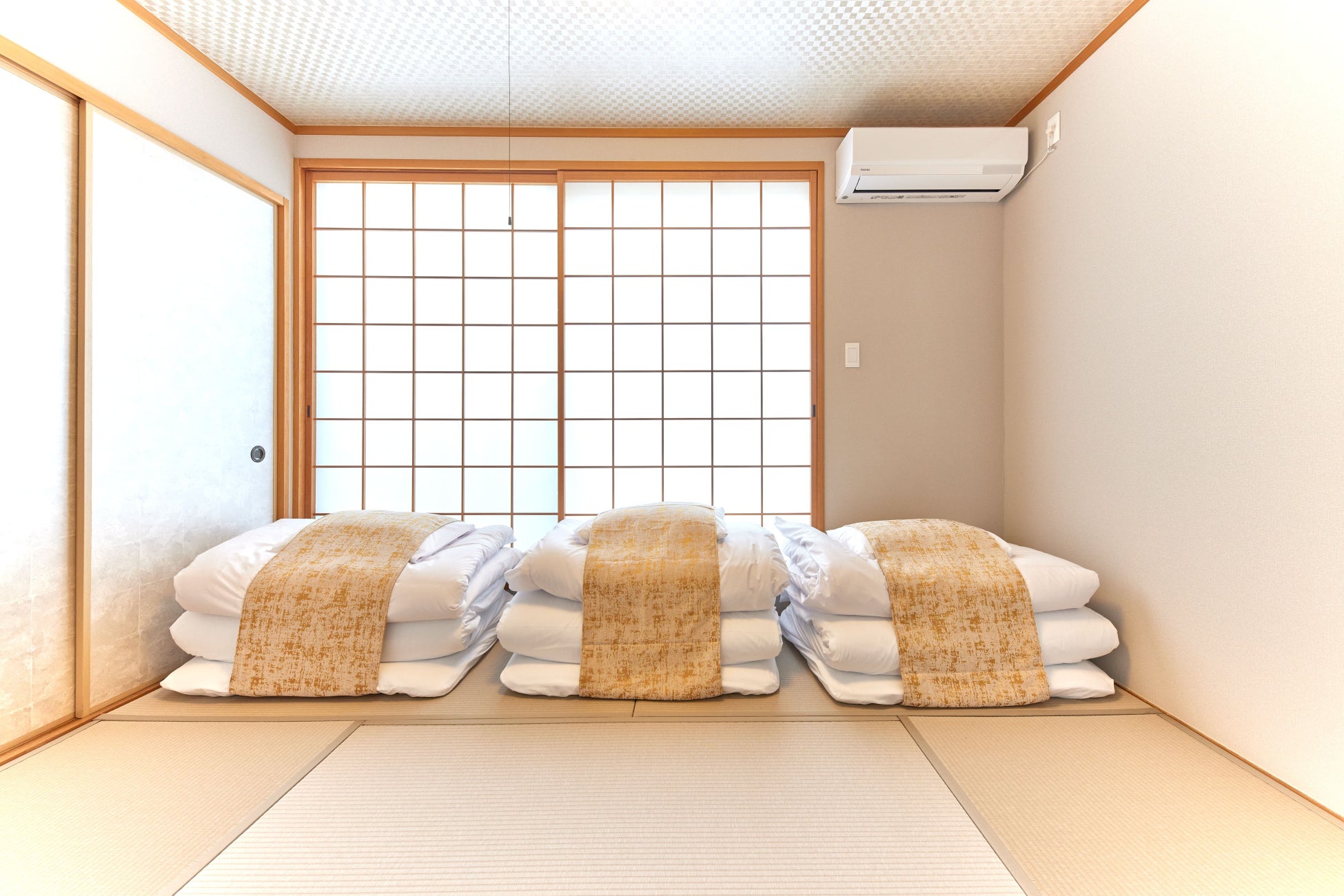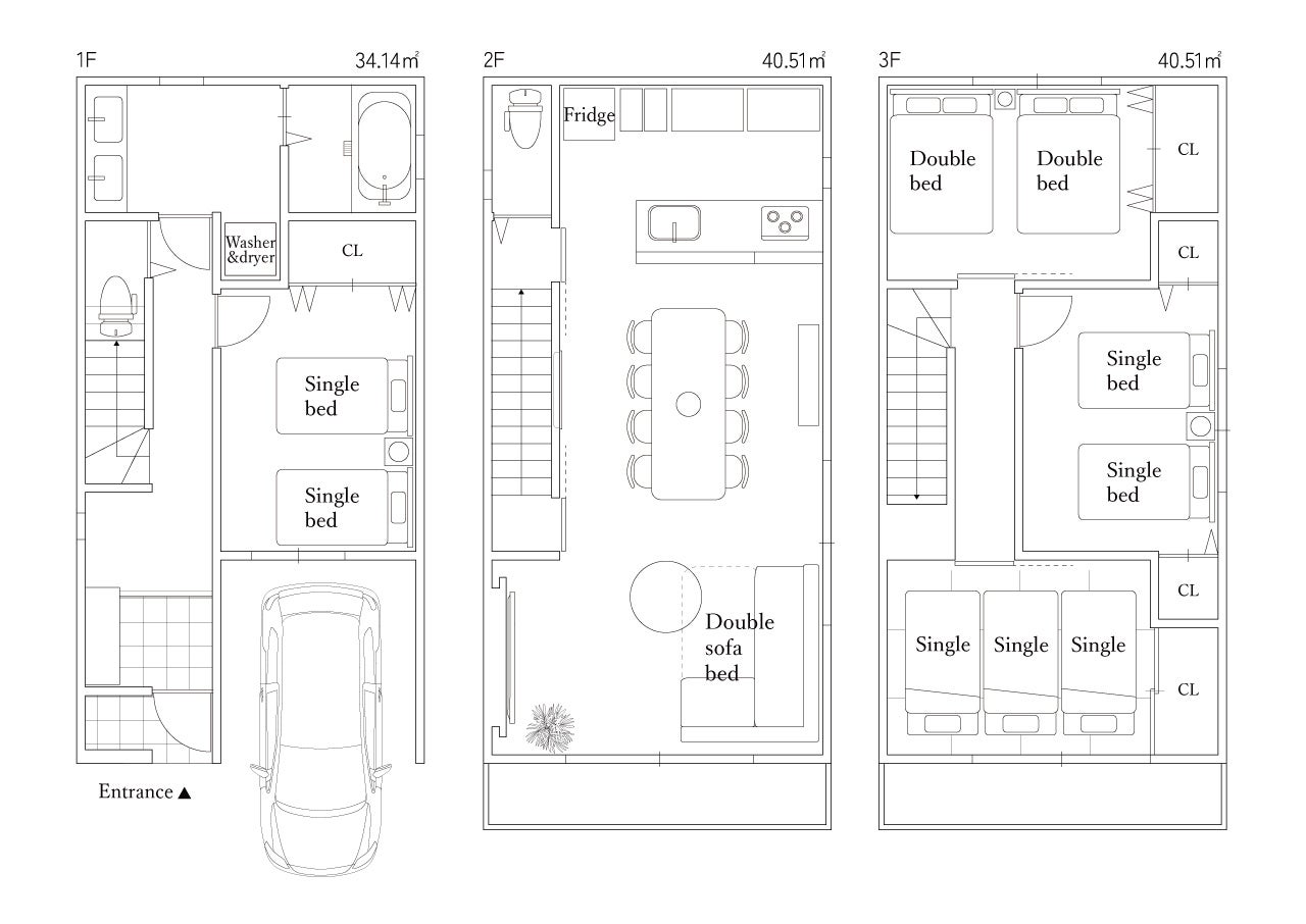 (1階居室:シングルベッド2台 リビング:ソファダブルベッド1台 3階居室1:ダブルベッド2台 3階居室2:シングルベッド2台 3階和室:布団3組)