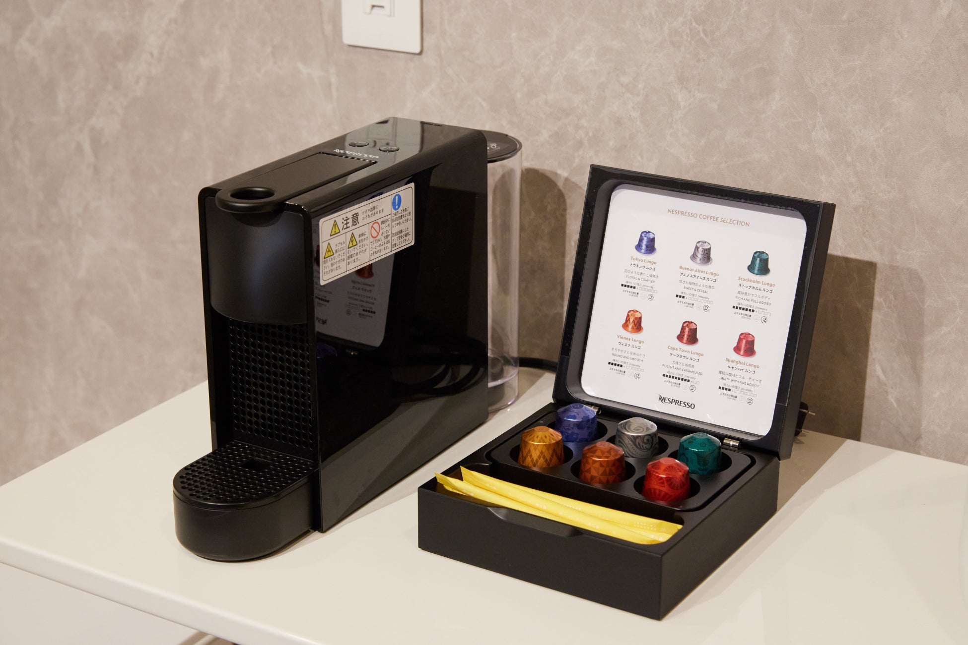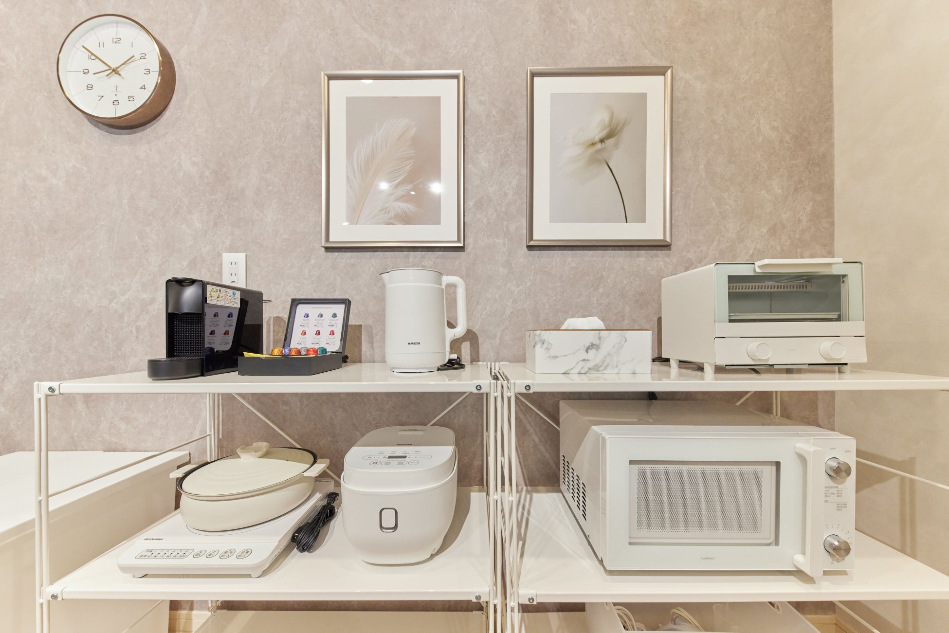 内装に合うよう白の家電で統一。インテリアにこだわった当民泊ブランド「eni.」ならではのこだわりです。また、ウェルカムドリンクとしてネスプレッソのコーヒーメーカーも設置。コーヒーは6種類からお選びいただけます。
