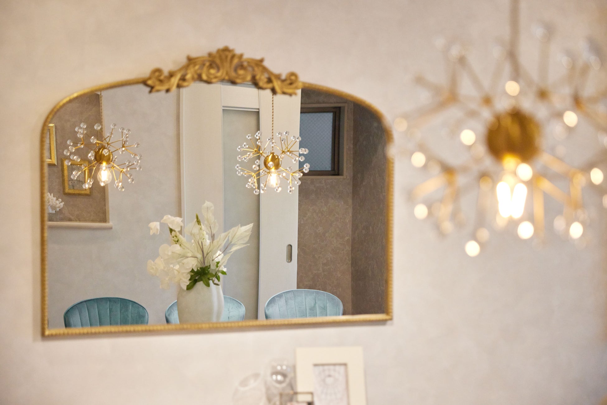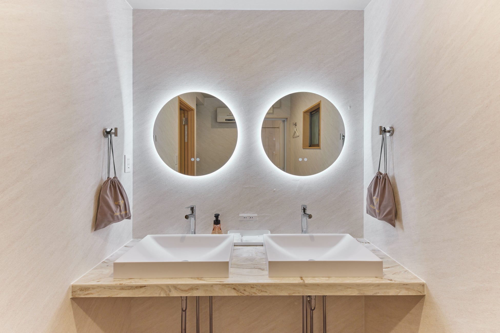 洗面脱衣室にはダブルボウルの造作洗面を設置。ミラーはeni.シリーズの象徴でもある円形のミラー。白い大理石調の洗面の天板やクロスが空間全体に高級感を与えてくれます。また、ミラー背面の関節照明は光が顔全体に均一に当たるため化粧がしやすく、2人同時に利用できるのもこだわりポイントです。