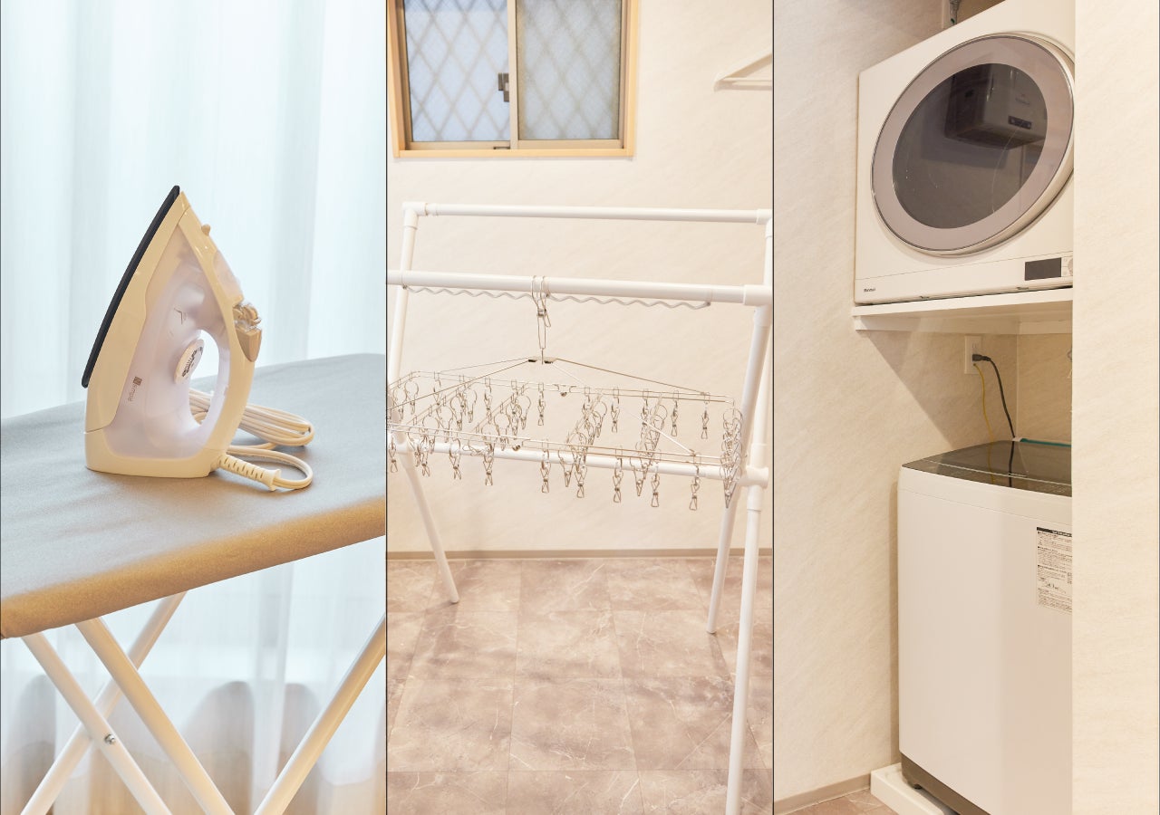 脱衣室にはその他にも洗濯機や乾燥機、物干しハンガーにアイロンも完備。長期滞在の際の衣類の洗濯問題もここなら安心です。