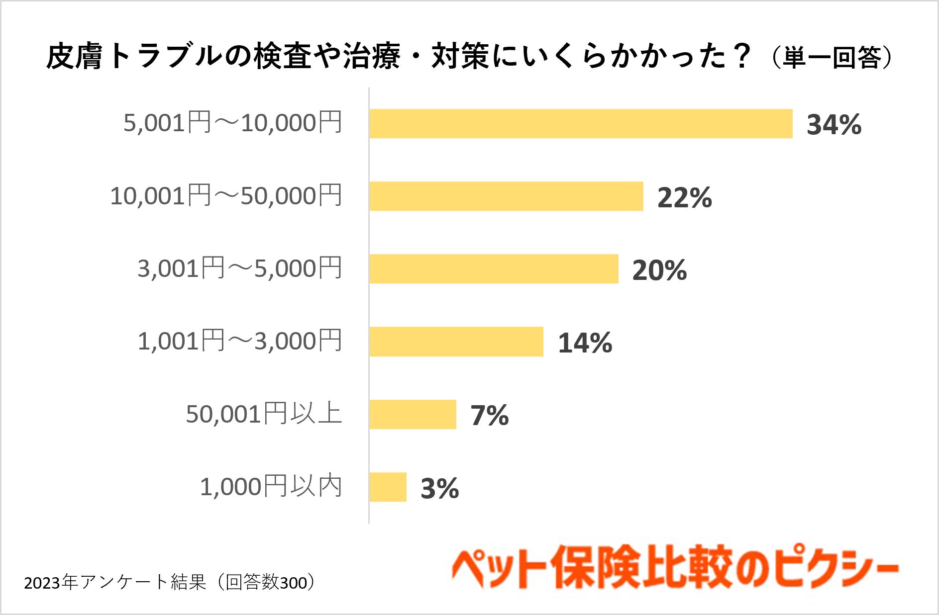 皮膚トラブルの検査や治療・対策にいくらかかったかの質問に対する回答は、1位が「5,001円〜10,000円(34%)」、2位が「10,001円〜50,000円(22%)」となりました。
