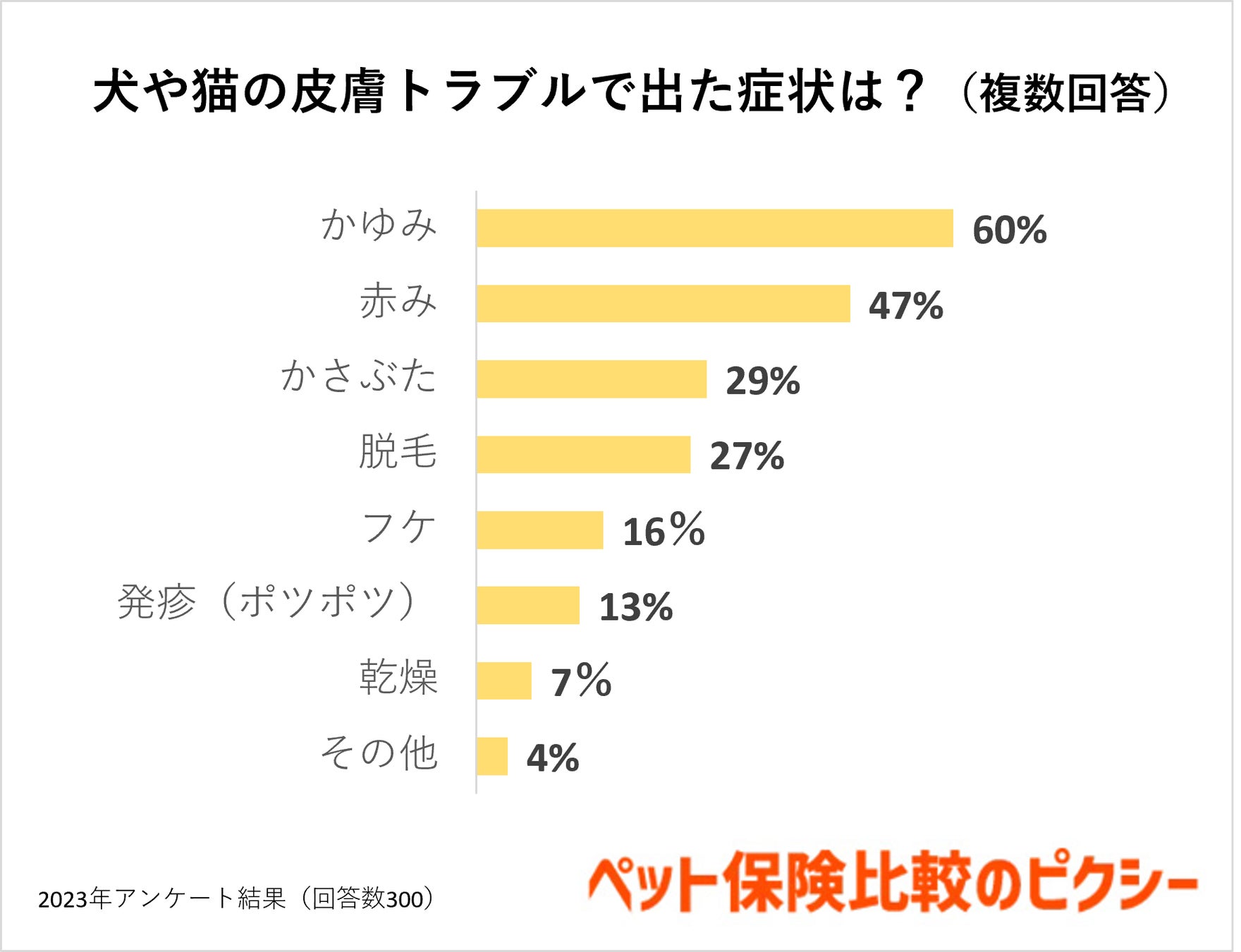 犬や猫の皮膚トラブルで出た症状の1位は「かゆみ(60%)」でした。