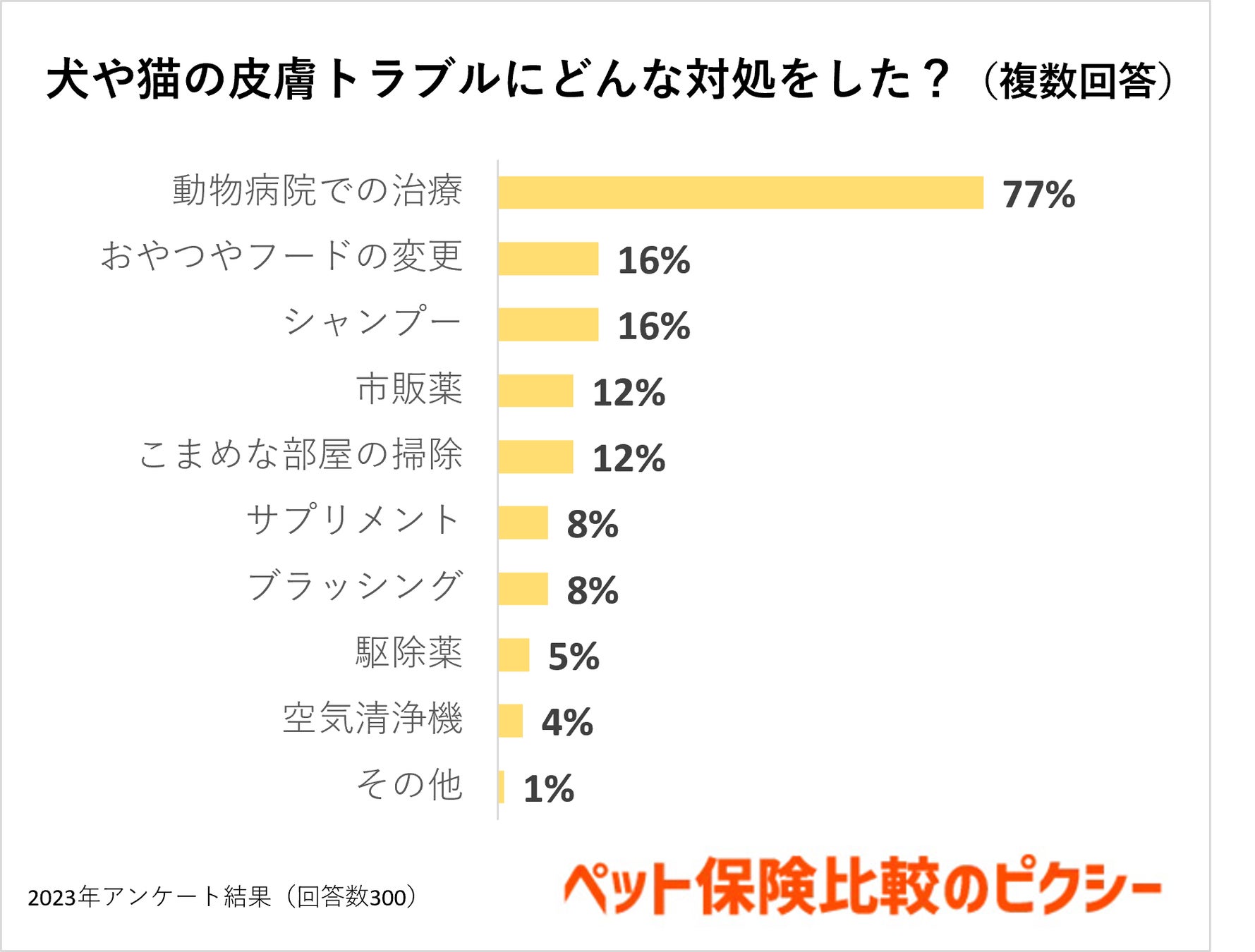 犬や猫の皮膚トラブルにどんな対処をしたかの質問には「動物病院での治療(77%)」の回答が1位でした。