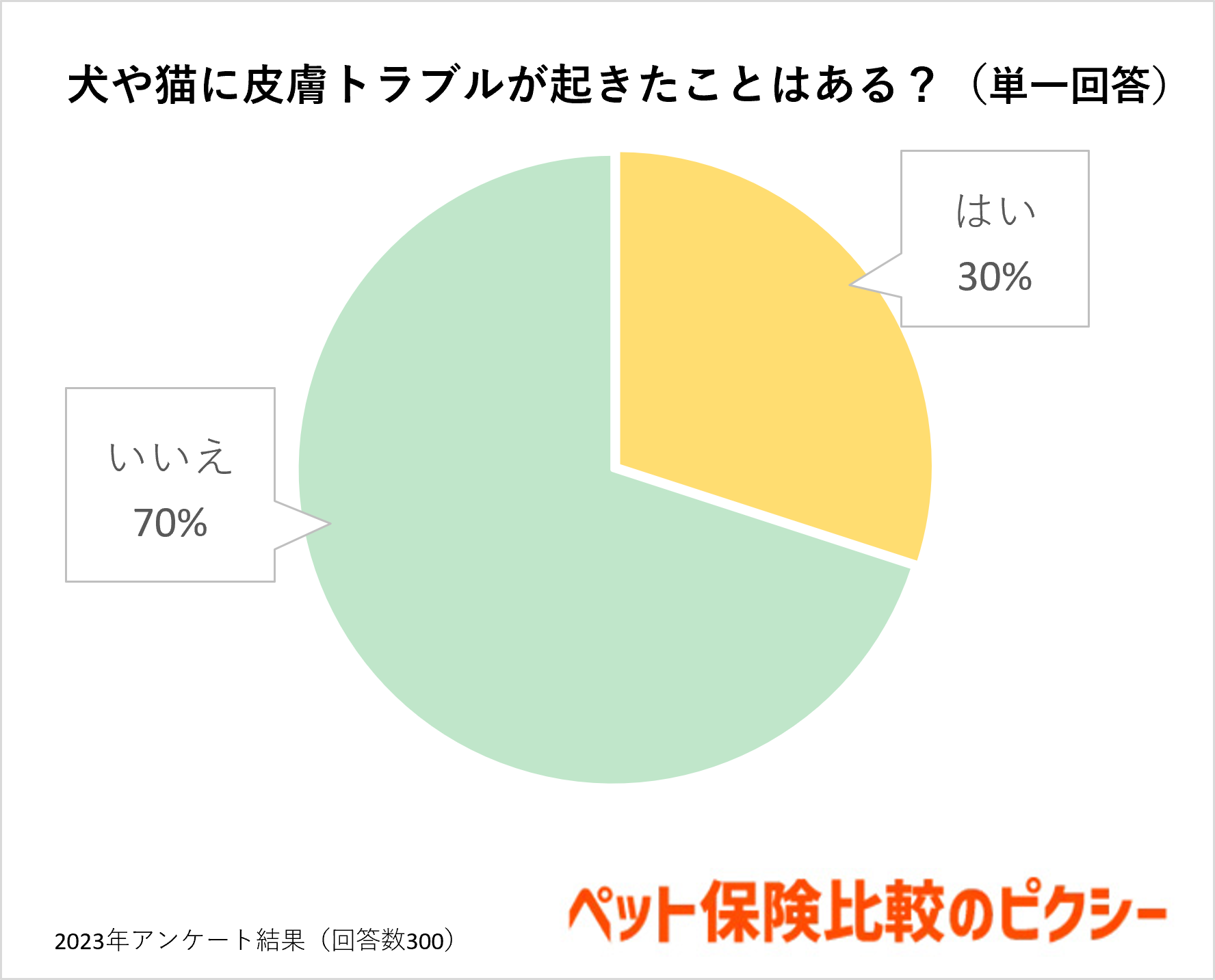まず初めにペットに皮膚トラブルが起きたことはあるかを質問したところ、「はい」と答えた人が30%、「いいえ」と答えた人が70%でした。