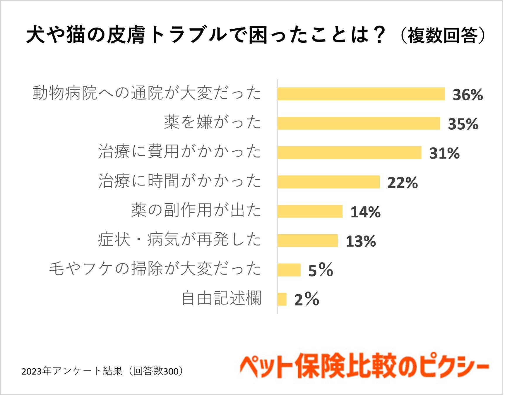 犬や猫の皮膚トラブルで困ったことの1位は「動物病院への通院が大変だった(36%)」2位は「薬を嫌がった(35%)」でした。