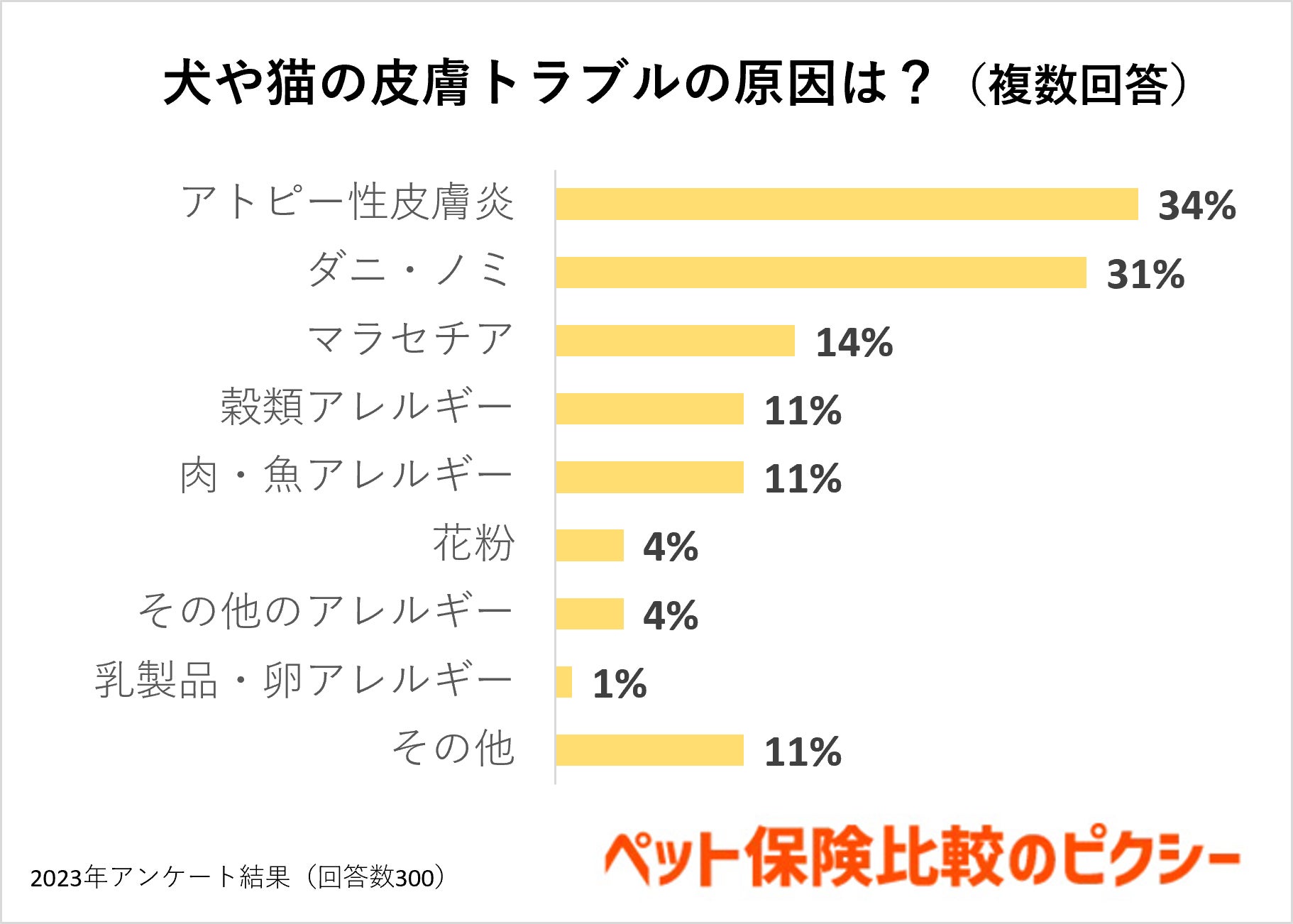 犬や猫の皮膚トラブルの原因を聞くと1位は「アトピー性皮膚炎(34%)」でした。