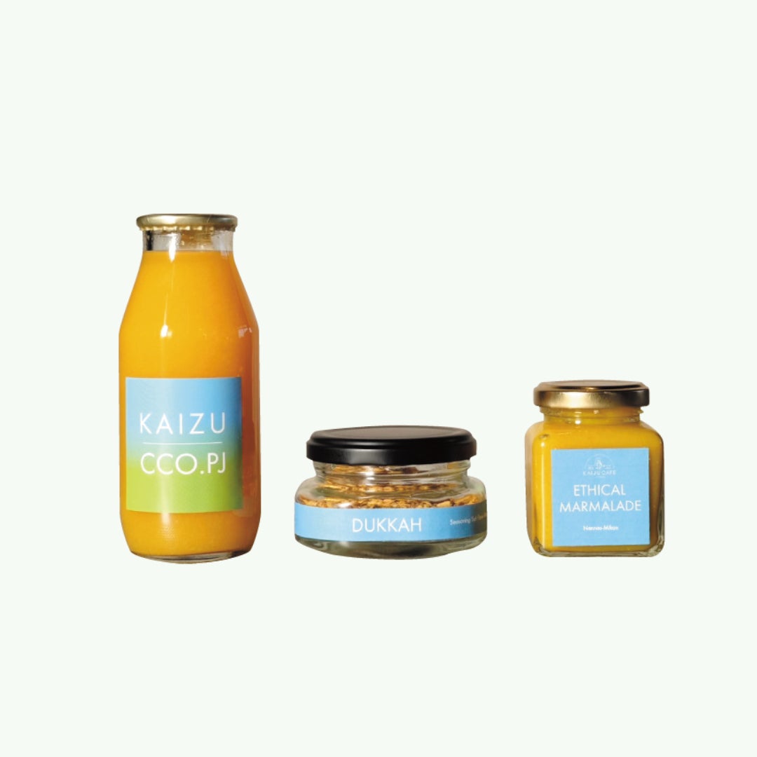 南濃みかん100%で保存料なし・補糖なしのみかんジュース。ジュースを絞る際に出るみかんの皮とパルプをピュレ状に仕上げたアップサイクルなマーマレード。ジュースを絞る際に出るみかんの皮とナッツ・スパイスを合わせたふりかける味変スパイス。南濃みかんを堪能できるセットです。