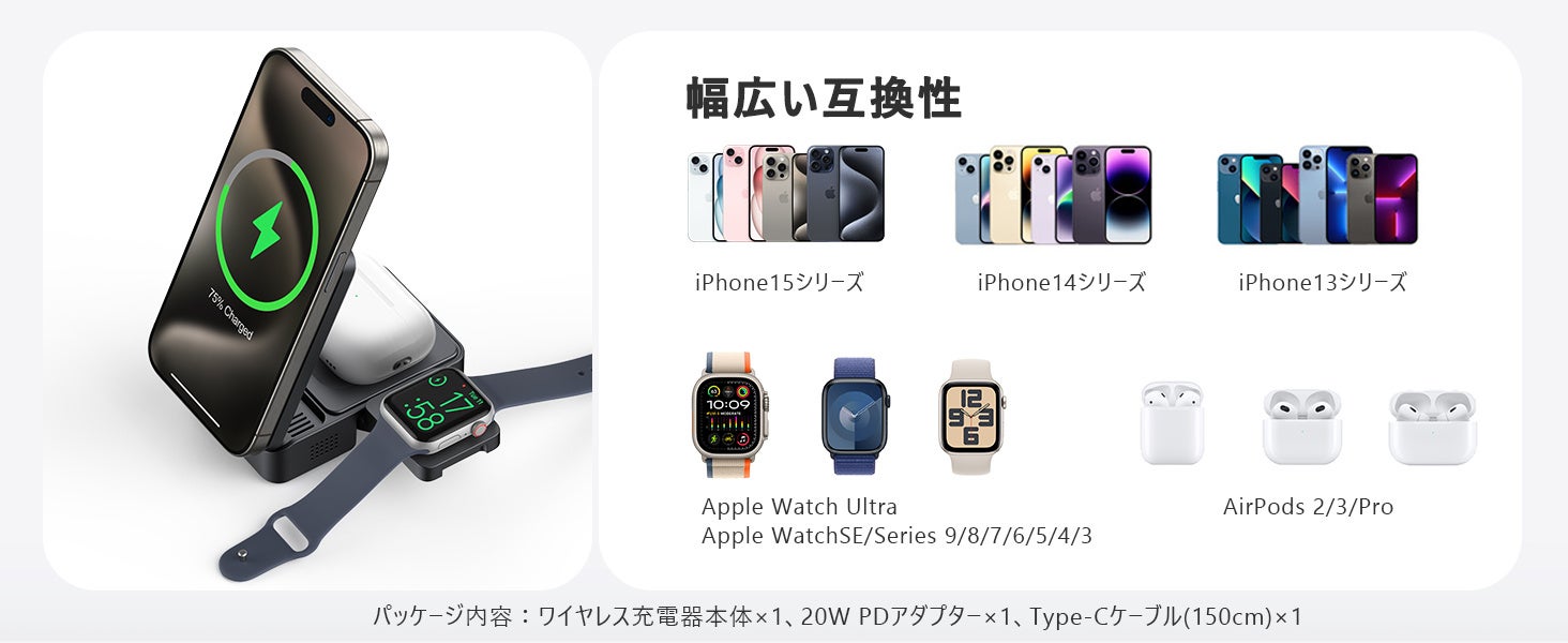 本製品のもう一つの魅力は、急速充電機能です。最大15Wの高出力で、iPhoneやApple Watch、AirPodsを短時間で効率よく充電できるのは大変便利です。最新のチップセットが搭載されているため、約2-3時間でデバイスが満充電になり、急いでいる時でもストレスを感じることがありません。特に、忙しい朝や出かける前に充電を忘れてしまった時でも、短時間で充電が完了するので安心です。