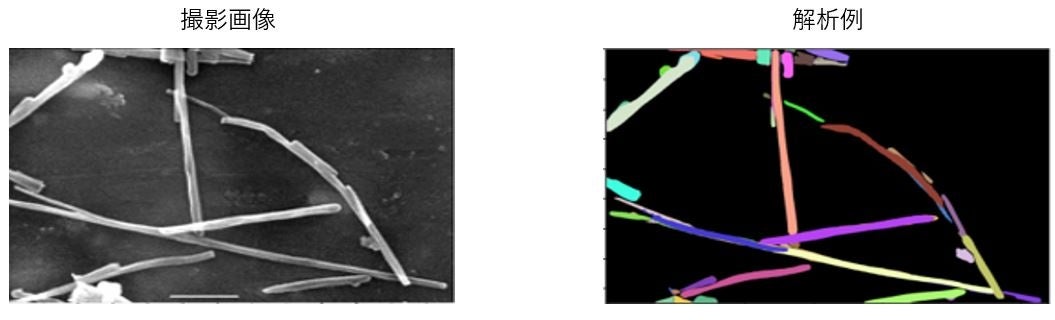 グラファイト繊維:撮影画像を解析し、各繊維を別々に識別することができている。