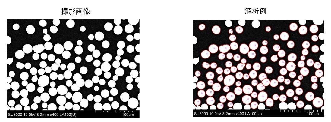 はんだ粒子:撮影画像を解析し、画面内の粒子の数量、寸法、真円度などを自動測定。