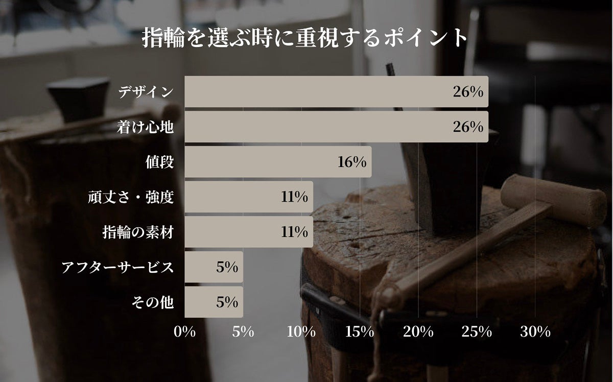 指輪を選ぶときにいちばん大事にされているのは「デザイン」と「着け心地」(各26%)。見た目が気に入ることはもちろん、毎日つけたくなるような快適さも重視されているのがわかります。「値段」(16%)や「強さ・素材」(各11%)など、長く使えるかどうかもポイントになっているようです。おしゃれさと実用性、どちらも大切にして選ばれていることがうかがえます。