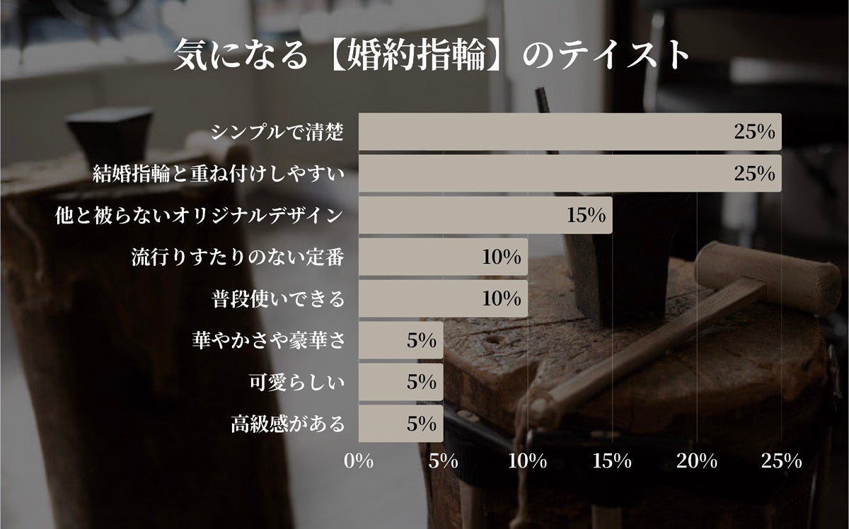 婚約指輪のテイストでは、「シンプルで清楚」「結婚指輪と重ね付けしやすい」(各25%)が最も多く選ばれており、上品で実用的なデザインが支持されている傾向が見られます。一方で「オリジナルデザイン」(15%)や「定番」「普段使い」(各10%)といった回答からは、個性と日常使いのバランスを重視する声も伺えます。