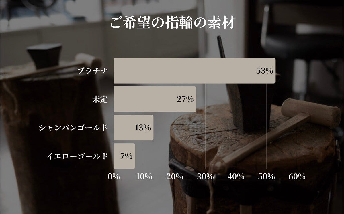 素材選びでは「プラチナ」(53%)が根強い人気を集め、王道として多くの支持を得ています。一方で「未定」(27%)という回答も多く、好みに合った素材をじっくり検討したいという前向きな姿勢が見受けられます。「シャンパンゴールド」(13%)や「イエローゴールド」(7%)を選ぶ方もおり、個性やこだわりを大切にしたいというニーズもありました。