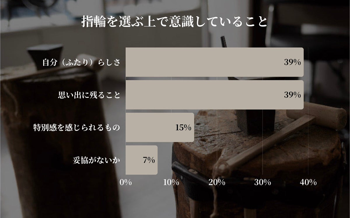 指輪を選ぶときに大事にしているのは、「ふたりらしさ」と「思い出に残ること」(どちらも39%)。デザインだけじゃなくて、その過程も思い出になるかどうかがポイントみたいです。「特別感がある」「妥協しないで選びたい」といった声もあり、自分たちらしく納得のいくリングを選びたい気持ちがしっかり伝わってきます。