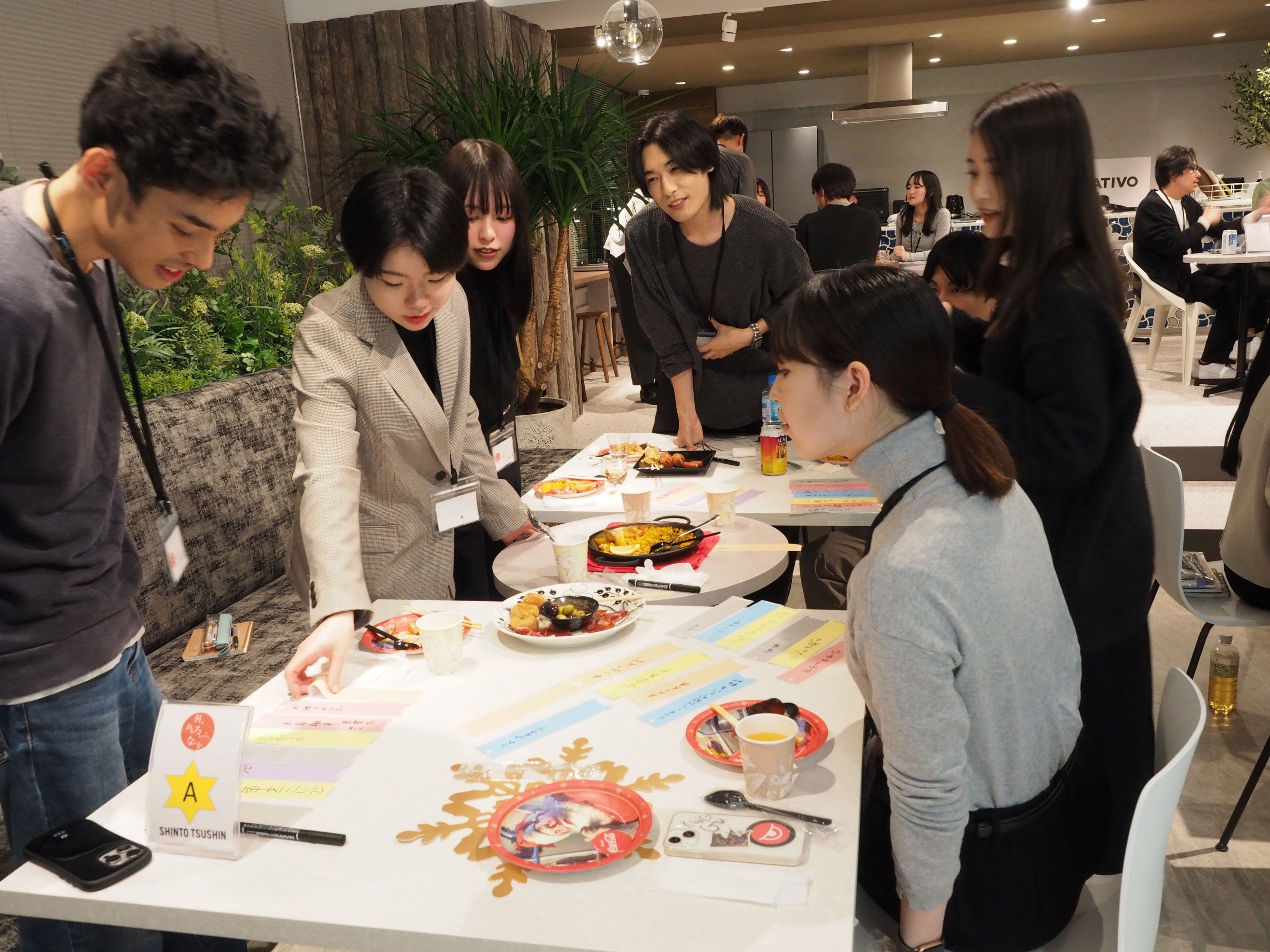 新東通信はスペインと日本との国際的な架け橋としての役割を果たし、相互の文化的な交流を促進するための活動も積極的に展開しています。それにちなみ、「X'masParty~Fiesta de Navidad~@東京銀座」とスペイン語でタイトルし、スペイン料理を味わいながら学生達が新東通信社員と共に「新しいコトバをつくる」というアイデアの発想体験を行いました。
