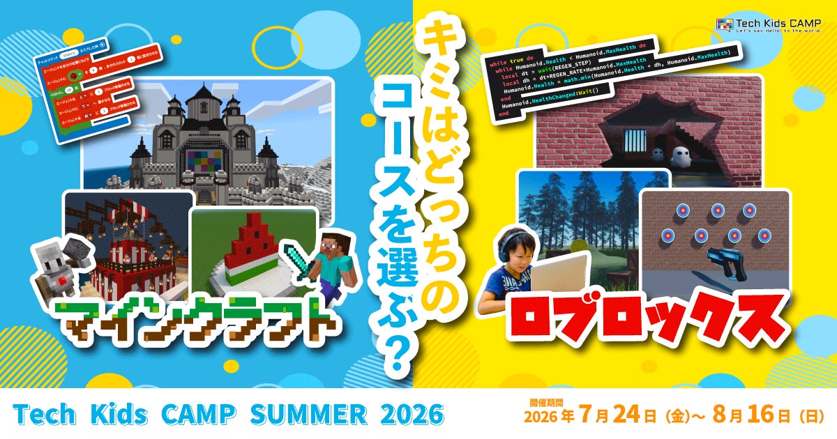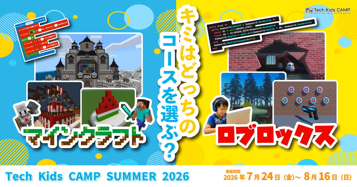 「Tech Kids CAMP Summer 2026」では、教育版マインクラフト「Minecraft Education」(※1)を使用するマインクラフトコースと、ゲーム開発環境「Roblox Studio」(※2)を活用するロブロックスコースの2コースを実施いたします。