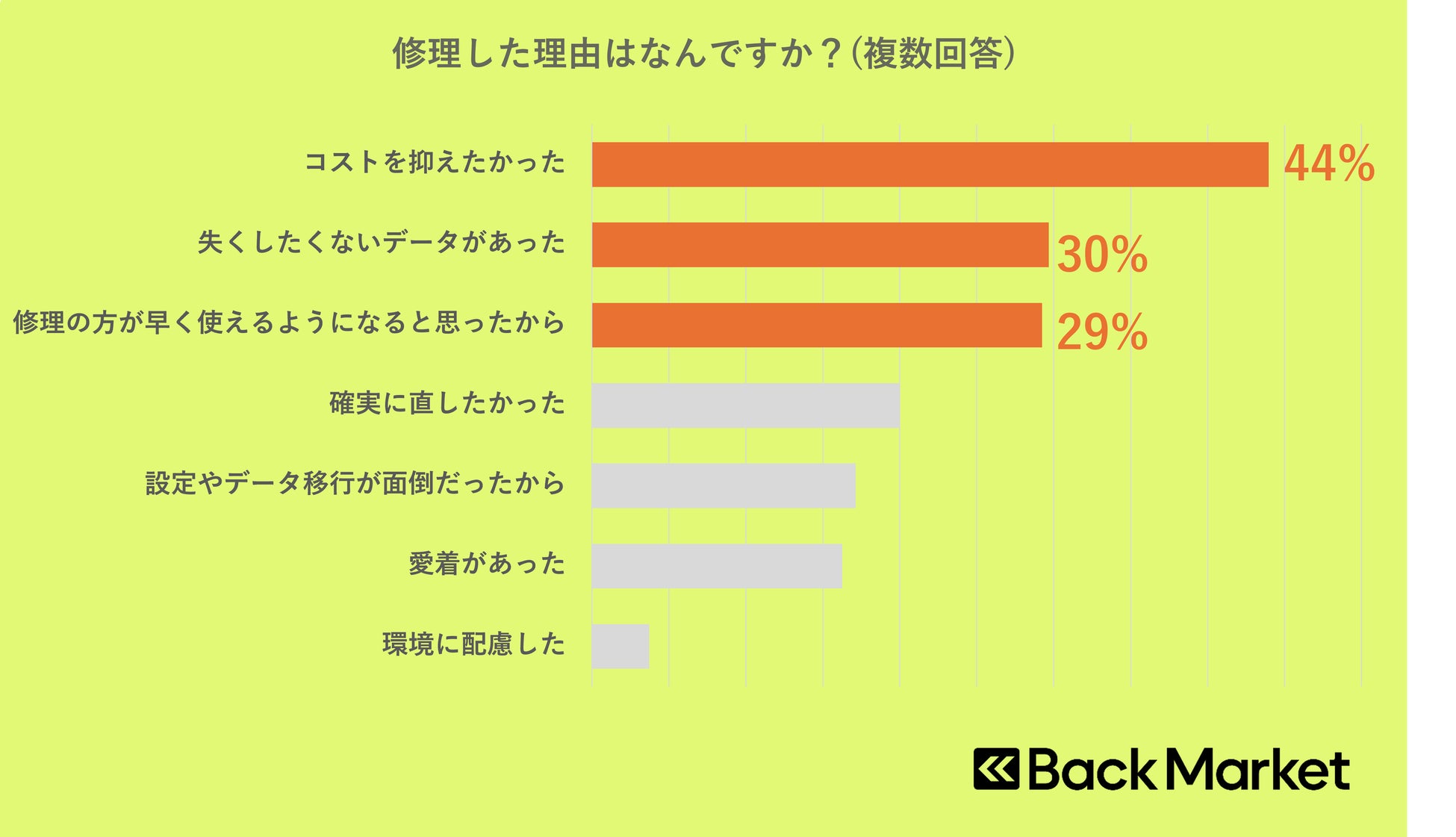 修理した理由としては、「コストを抑えたかった」(44.0%)や「大事なデータを残したかった」(29.7%)、「修理のほうがすぐ使えると思った」(29.2%)などが挙げられ、日常生活の節約や利便性を考えて修理を選んでいることが分かります。スマートフォンやPCが生活の中心となった現代では、修理によってコスト面の負担を抑えつつ、大切なデータを守る安心感も得られることが、消費者にとって大きな価値になっていると考えられます。