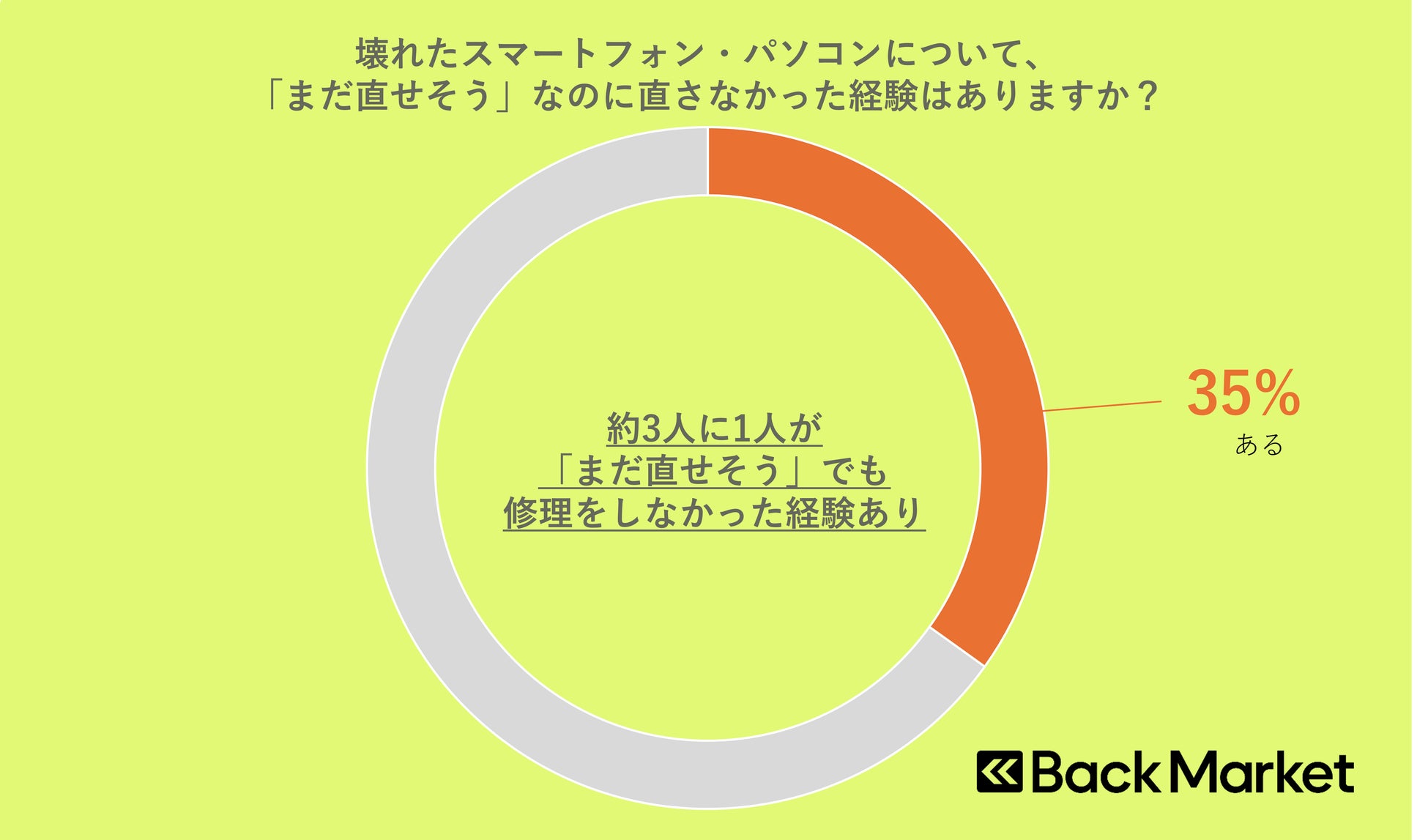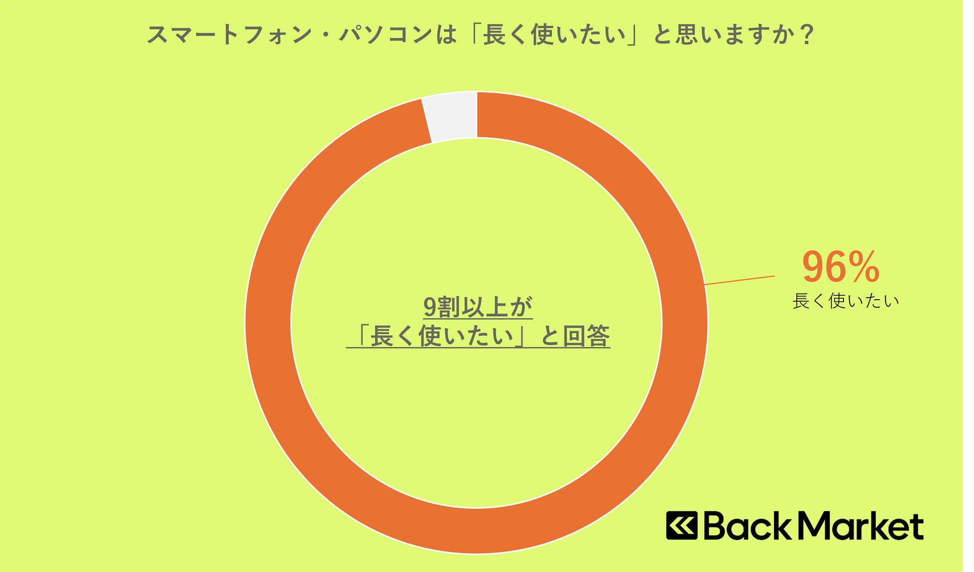 スマートフォン・PCは「長く使いたい」と思うかどうか質問したところ、9割以上(96.2%)がスマートフォンやPCを「長く使いたい」と考えていることが分かりました。一方で、約3人に1人(34.9%)は「まだ直せそう」なのに修理をしなかった経験があることも明らかになりました。
