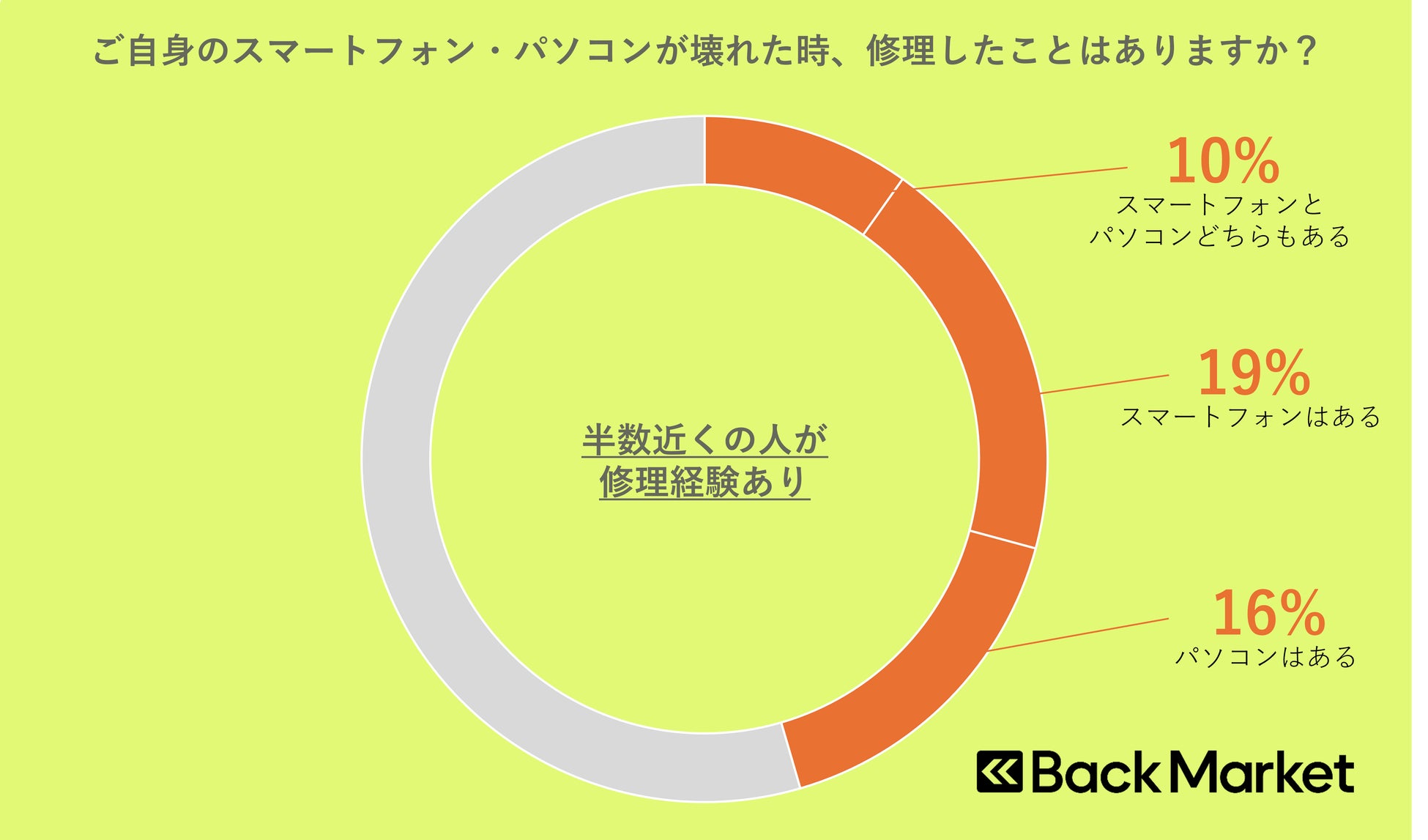 また、自身で使用しているスマートフォン・PCが壊れた際に修理したことがあるかどうかを聞いたところ、半数近くの人がスマートフォンやPCが壊れたときに修理した経験があることが分かりました。