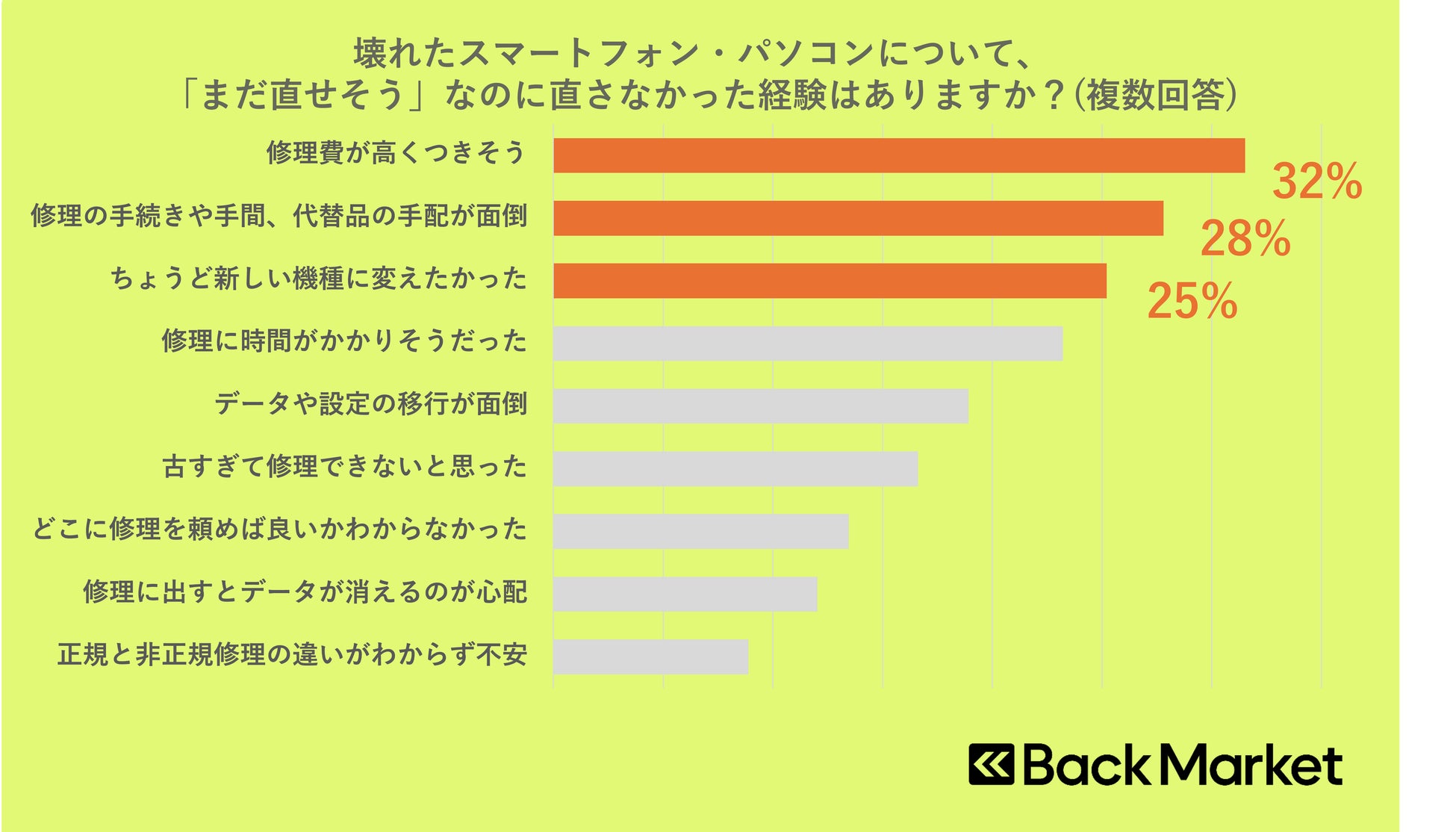 その理由としては、「修理費が高くつきそう」(31.5%)や「修理の手間が面倒」(27.8%)、「新品への買い替えを選んだ」(25.2%)などが挙げられ、長く使いたいという意識と、実際の行動との間に大きなギャップがあることが明らかになりました。背景には、修理費用や手続きの煩わしさといった実務的なハードルに加え、新品買い替えの方が手間が少ないという意識が影響していると考えられます。