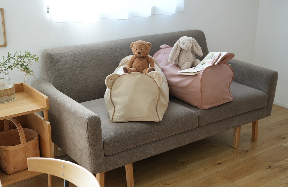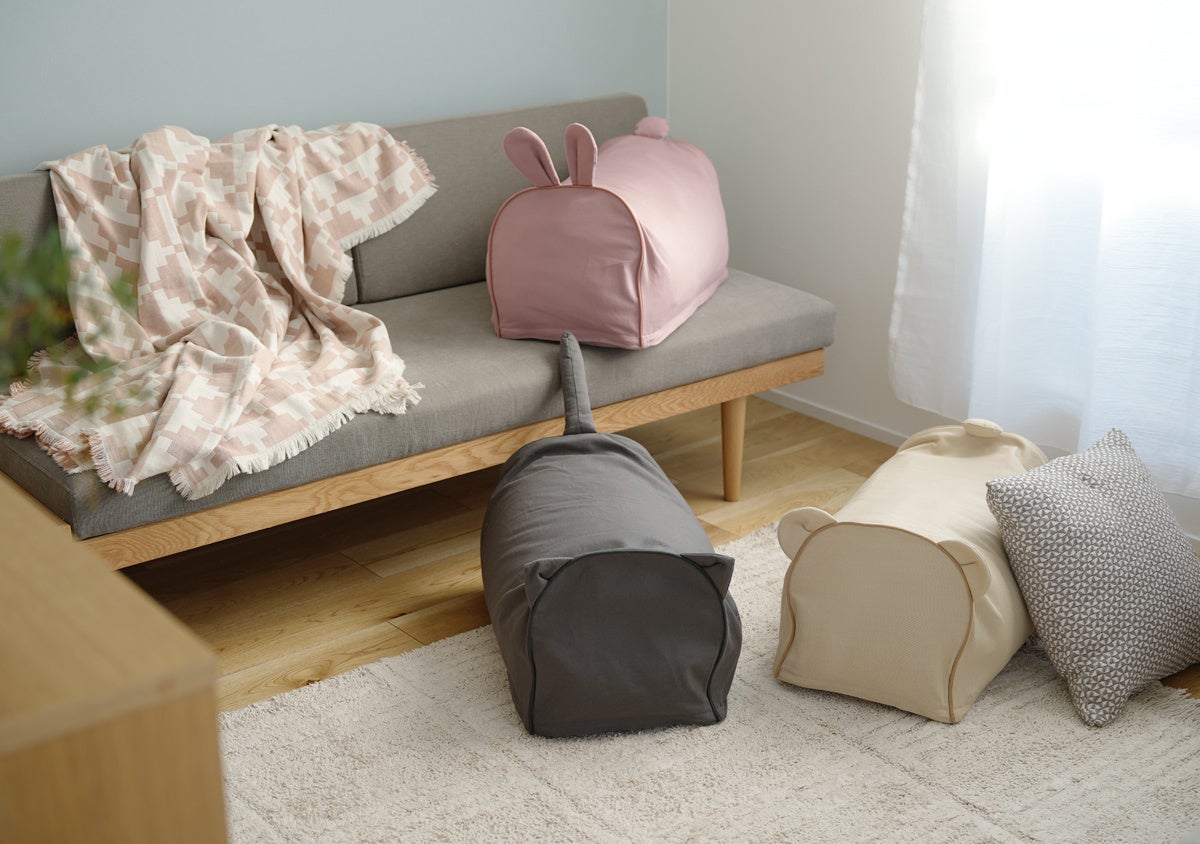 収納スペースでかさばっていたものを、アニマルクッショとして、子ども部屋やリビングで見せ置きすることができます。
