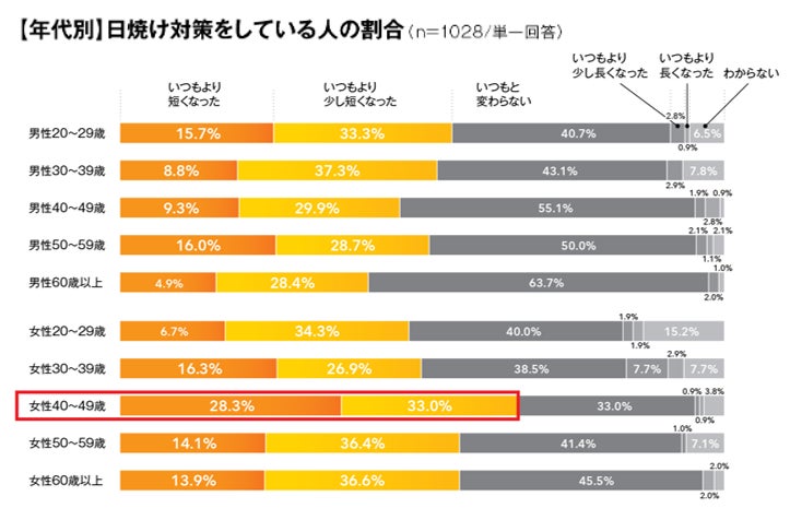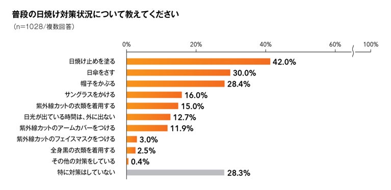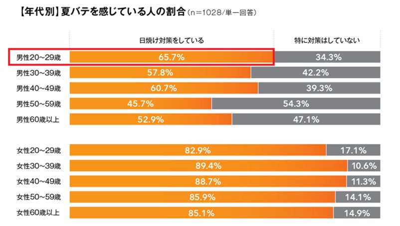 普段の日焼け対策状況について、日焼け対策をしている人は7割以上(71.7%)に上りました。そのうち、日焼け止めを塗っている人は4割以上(42.0%)にのぼりました。男女別で見ると、男性で日焼け対策をする人が多かったのは20代男性(65.7%)。女性は全年代で8割以上が日焼け対策をしているということがわかりました。