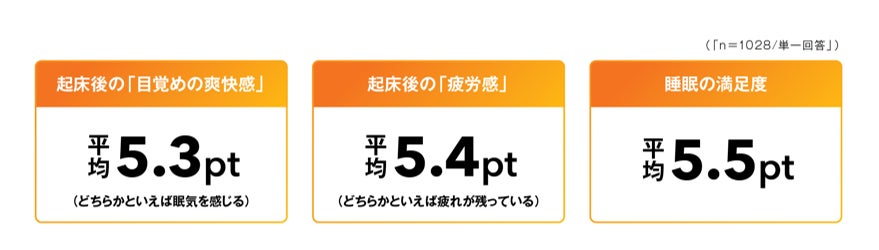 最近の、起床後の「目覚めの爽快感」について、10段階で回答いただいた結果、平均は「5.3ポイント(どちらかといえば眠気を感じる)」。「疲労感」については、平均「5.4ポイント(どちらかといえば疲れが残っている)」、そして睡眠の満足度については、平均「5.5ポイント」という結果となりました。