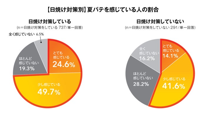 一方で、日焼け対策をしていない人で夏バテを感じる人は55.7%に対し、日焼け対策をしている人で夏バテを感じる人は74.2%という結果に。日焼け対策をしている人ほど、夏バテを感じる傾向が高いことが判明しました。