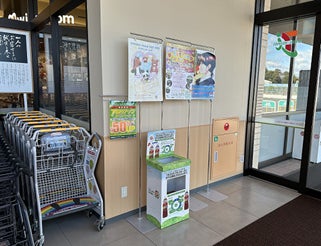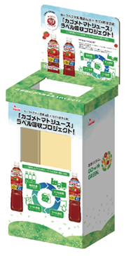 カゴメトマトジュースPETボトルの写真とリサイクルによる資源の循環をデザインした専用の回収ボックス(画像右)を店舗の入り口に設置
