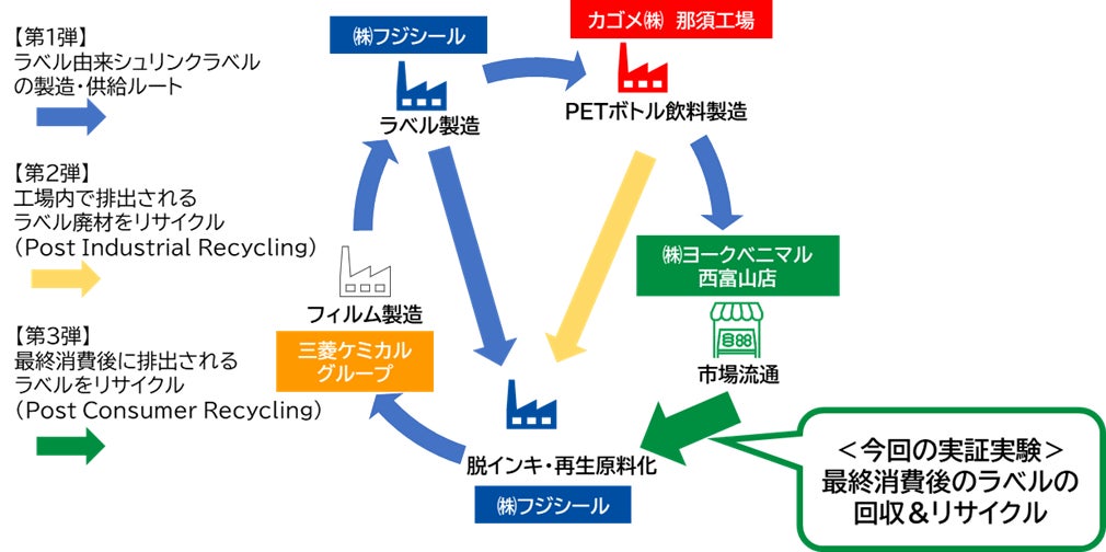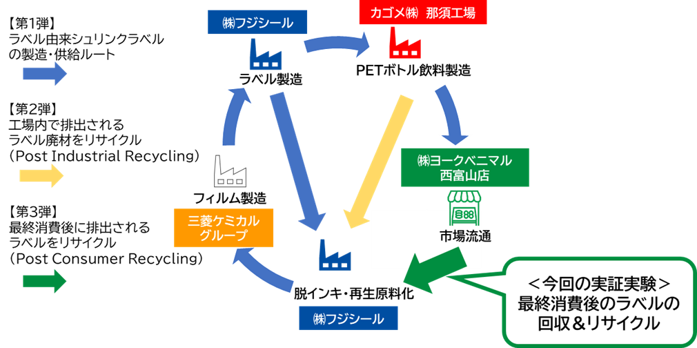三菱ケミカルグループ(以下「当社グループ」)は、カゴメ株式会社(本社:愛知県名古屋市 代表取締役社長:山口 聡、以下「カゴメ」)、株式会社フジシール(本社:東京都千代田区、代表取締役社長:柴田康裕、以下「フジシール」)と協働し、カゴメの一部商品に採用されている資源循環型(ラベルtoラベル)シュリンクラベルの市場回収による水平リサイクル実現に向け、実証実験を開始することをお知らせします。