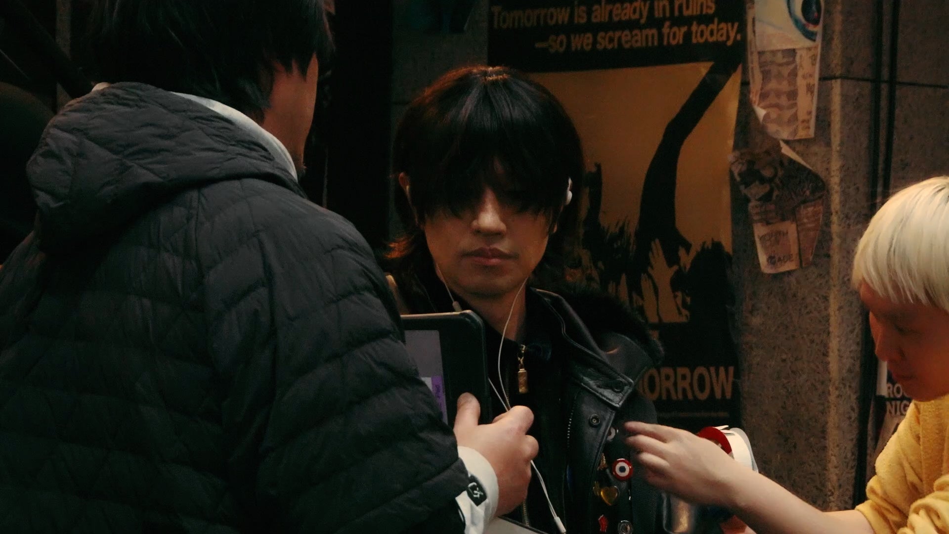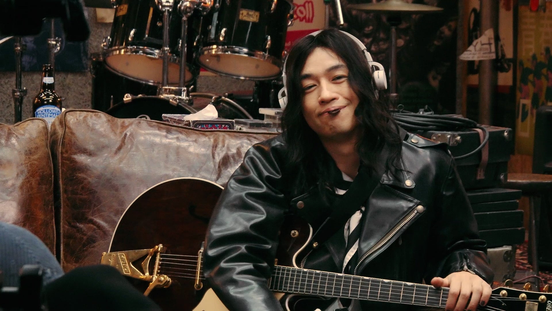 今回、斎藤工さんが初挑戦となる1人4役の撮影が行われました。スタジオには、何もない空間に家具やポスター、バンド機材が搬入され、本物のたまり場のようなセットが再現されました。リハーサル中、斎藤さんはそれぞれの楽器を演奏しながら役作りに没頭。その真剣な表情は、まるでバンドの出番を待つような緊張感を漂わせていました。そして、ボーカル担当・DOTSのシーンから撮影がスタート。