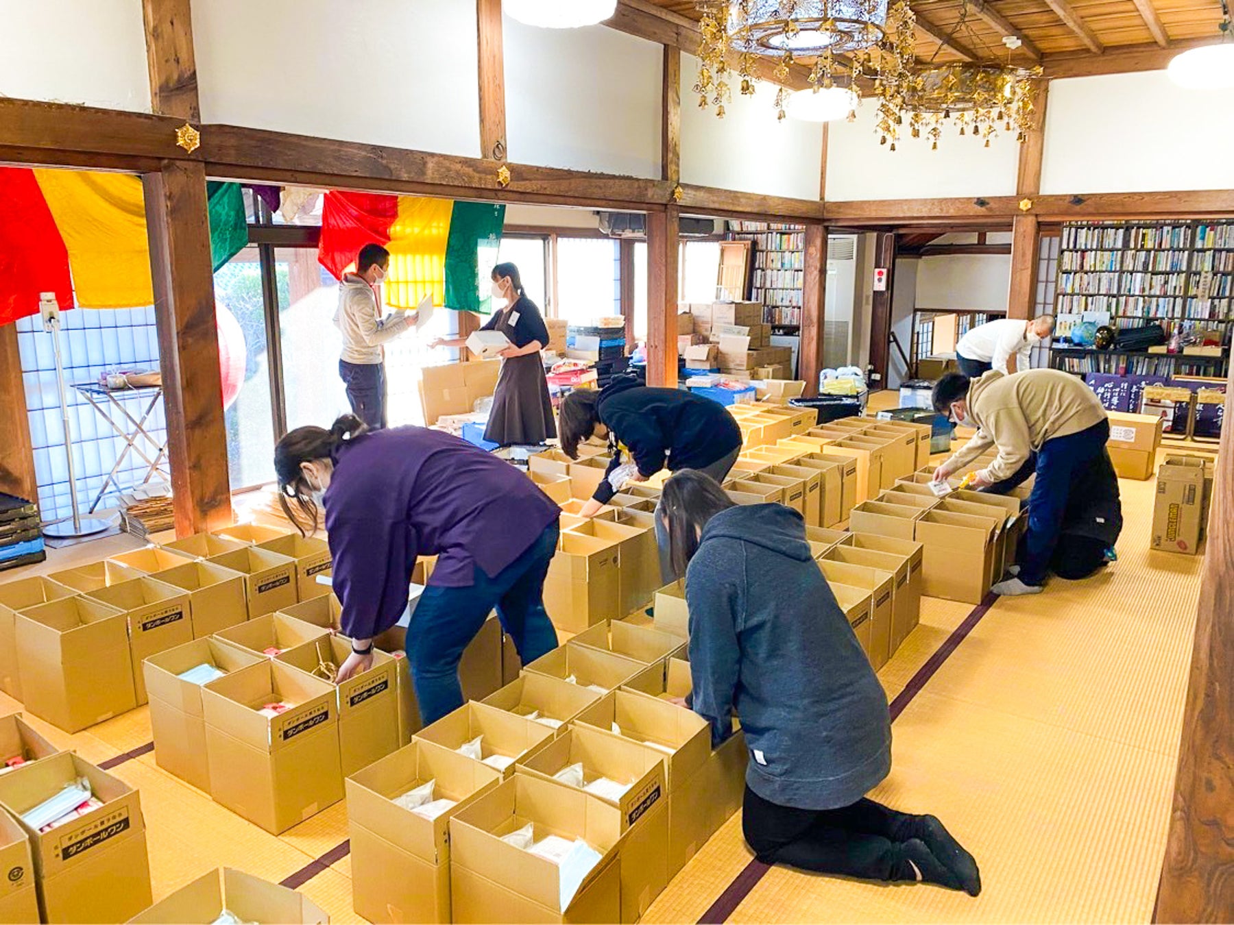 期間中、全国各地の寺院で行われる「発送会」では、ボランティアが家庭に届ける「おすそわけ」を心を込めて梱包します。