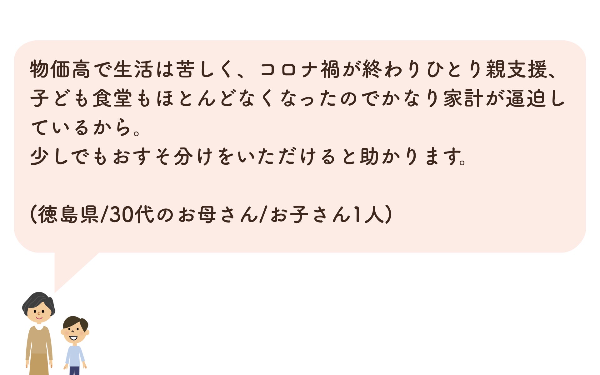 給食のない冬休みを迎えるひとり親家庭2,500世帯に、「おすそわけ」を通して食べものとぬくもりを届ける取り組みです。