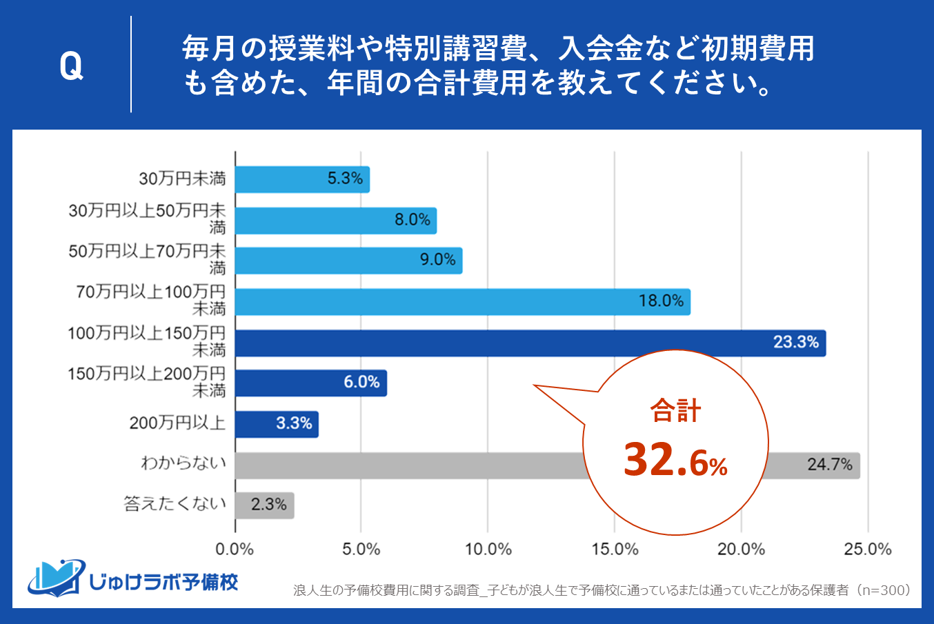 続いて実施した浪人生の保護者を対象とした1年間でかかる年間の塾・予備校費用に関するアンケート調査の結果、年間の総費用(季節講習や特別講習代含む)に関しても新たな事実が判明しました。