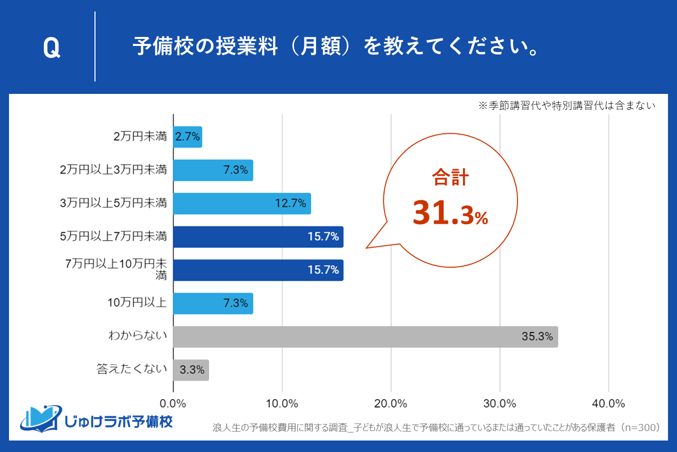 アンケート結果から、「5万円以上7万円未満」を支出している保護者が15.7%(47人)、また「7万円以上10万円未満」も15.7%(47人)という結果が出ています。これは、多くの予備校や塾の平均的な価格帯がこの範囲にあることを示唆しており、この価格帯が多くの家庭にとっての選好となっている可能性が高いと思われます。