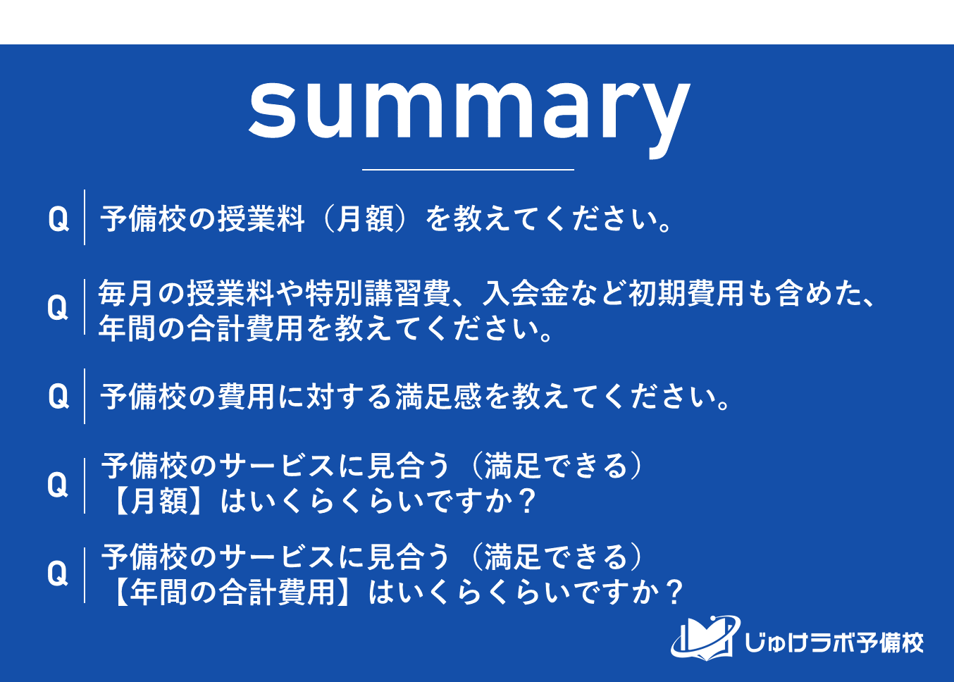 アンケートの結果、年間の総費用について「わからない」と回答した保護者が74人、割合で言うと24.7%となっています。年間での教育費用の総計は、各種の講習費や教材費、その他の付随する費用などが含まれるため、具体的な額が不明確になりがちであることが考えられます。予備校・塾関係者には、今よりも年間の総費用の内訳や計算方法を明示し、保護者にとっても理解しやすい情報提供が求められていることがわかります。
