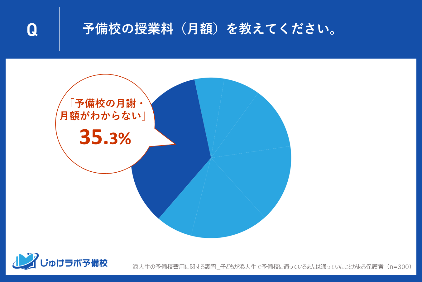 アンケートの結果、「月の教育費用についてわからない」と回答した保護者が106人、割合で言うと35.3%となっており、この数字の高さが注目されます。このことから、予備校や大学受験の塾からの情報提供が不足していたり、費用の内訳が複雑で理解しづらかったりする可能性が考えられます。この事から予備校や塾は、費用の透明性を高め、よりわかりやすい情報提供を行う必要があると言えます。