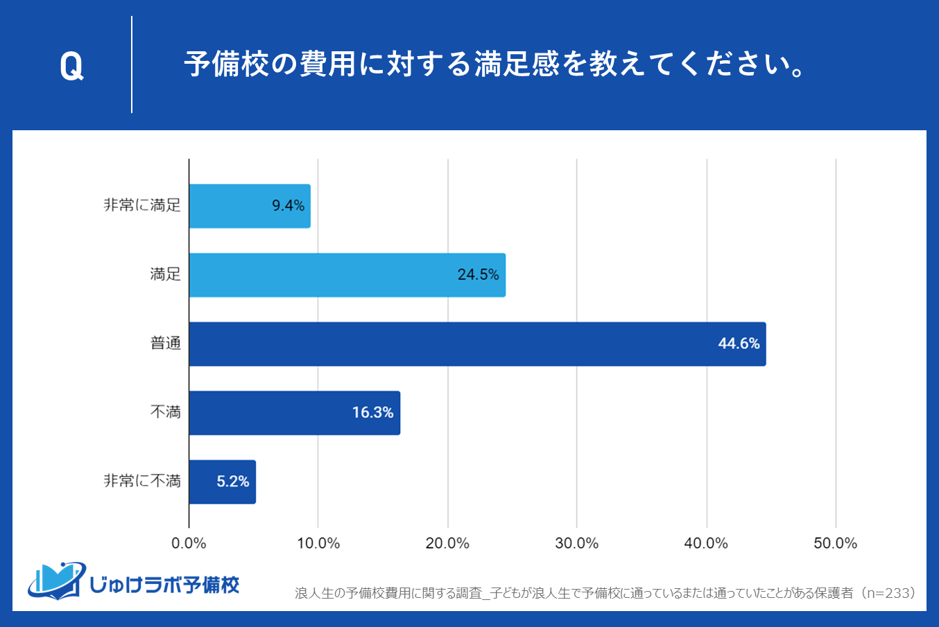 アンケート結果より、「普通」と感じている保護者が44.6%(104人)と最も多くなっています。これは、現在の教育費に対して特段の満足や不満を感じていない、あるいは予備校や塾のサービス内容と費用が適切にバランスしていることを示唆している可能性があります。